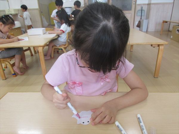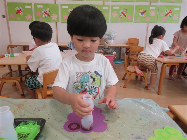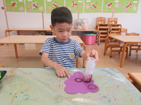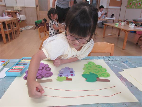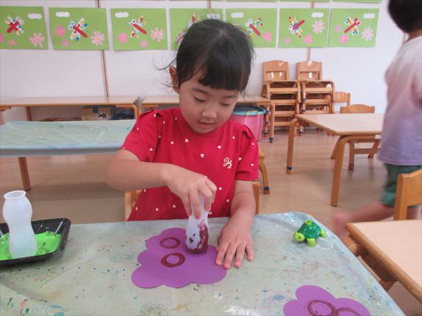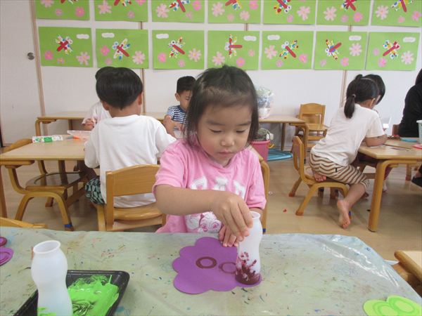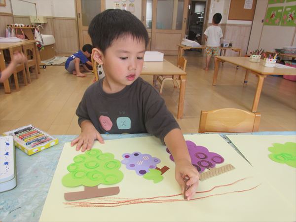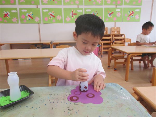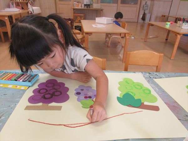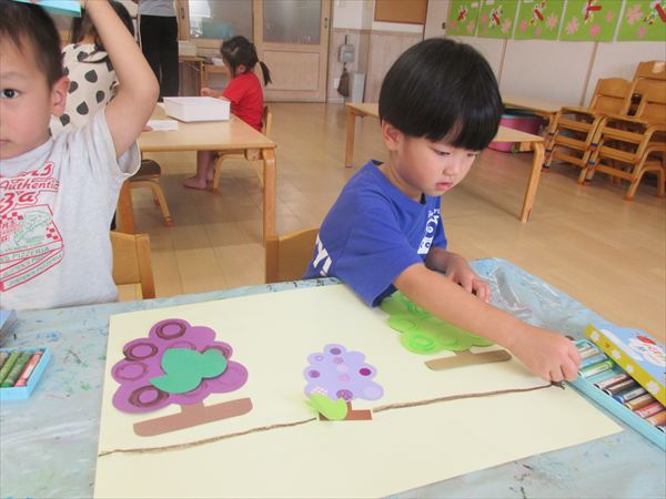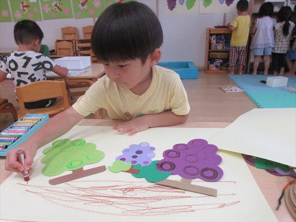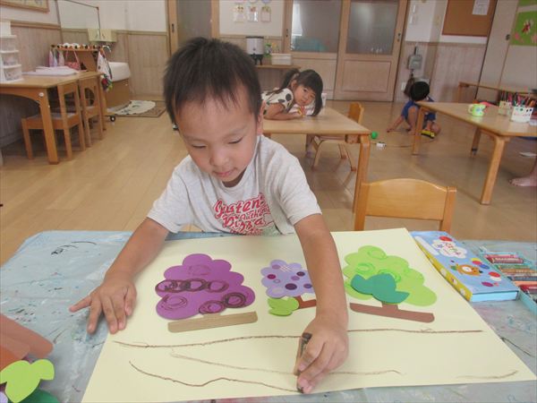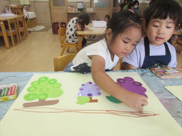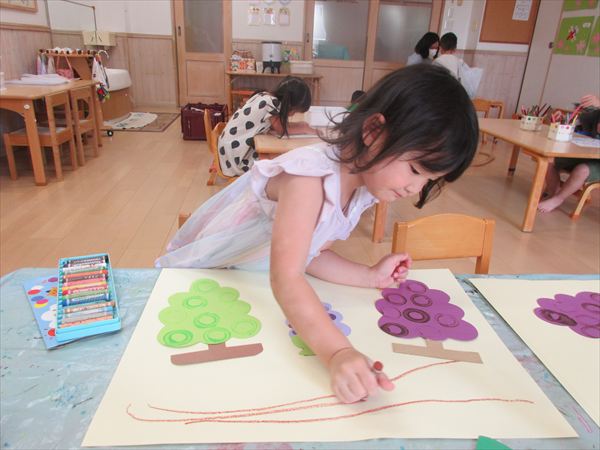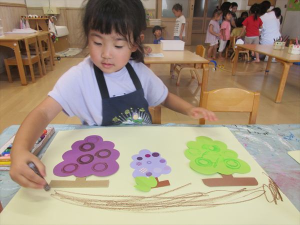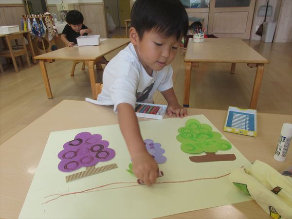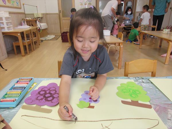 スタンピングでブドウを作りました。シールで作ったブドウと一緒にクレパスで木の枝を描いて繋ぎました。スタンピングは押した後に丸い形が出来たのを見て笑顔になっていましたよ!