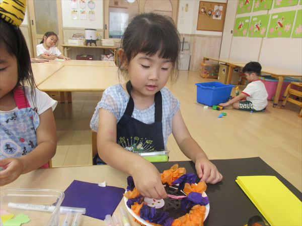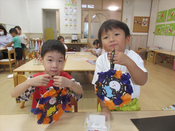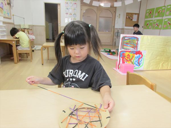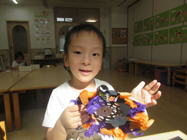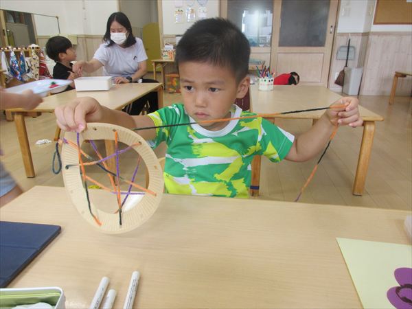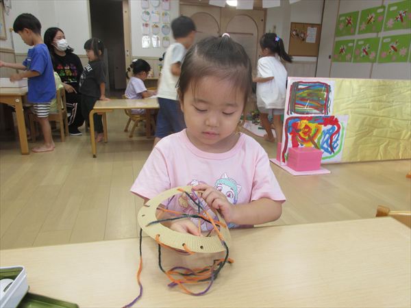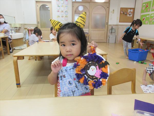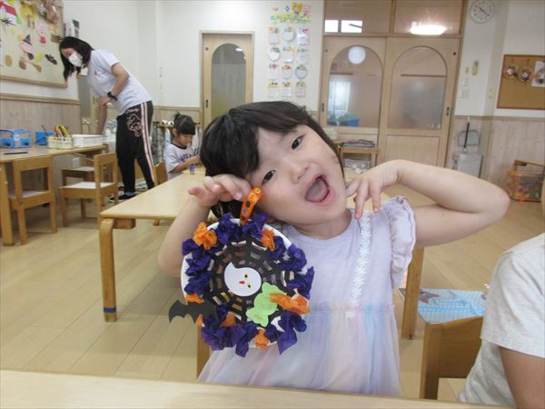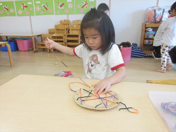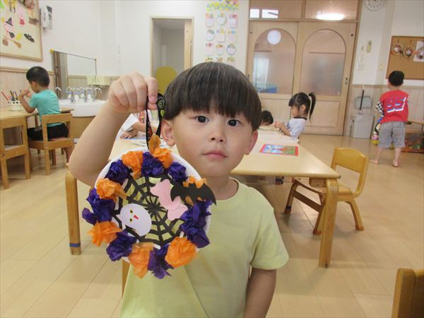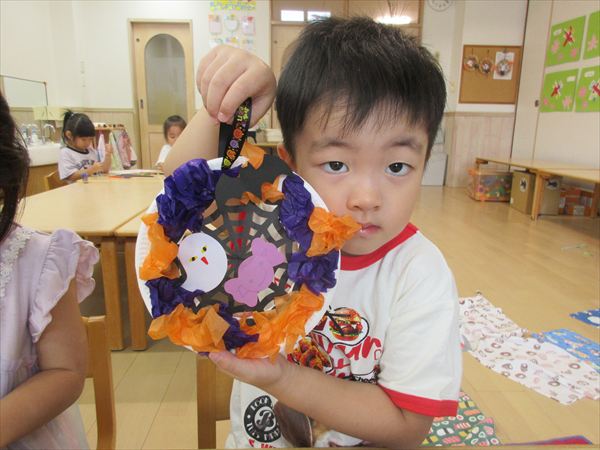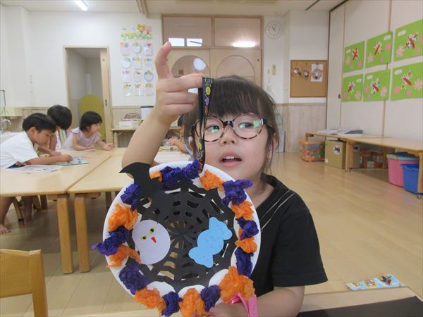 ハロウィンリースを、2種類作りました!クモの巣とクモを見て、怖いけど好き!という反応が面白かったです!ひもとおしは真剣な顔で集中していましたよ。