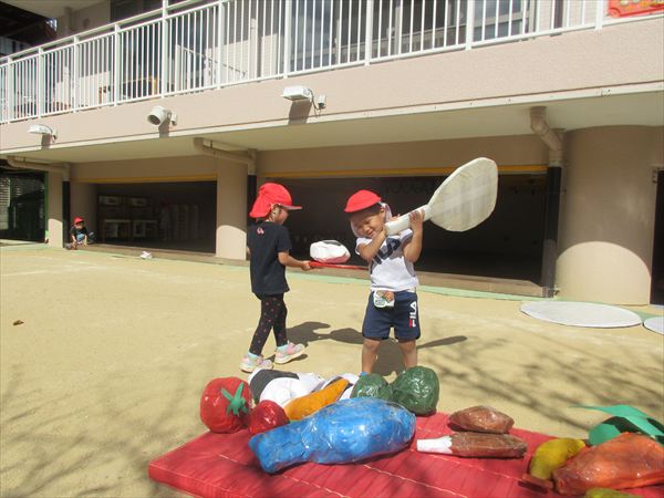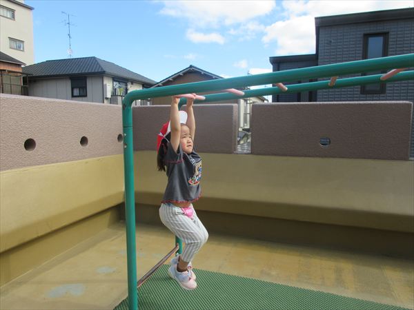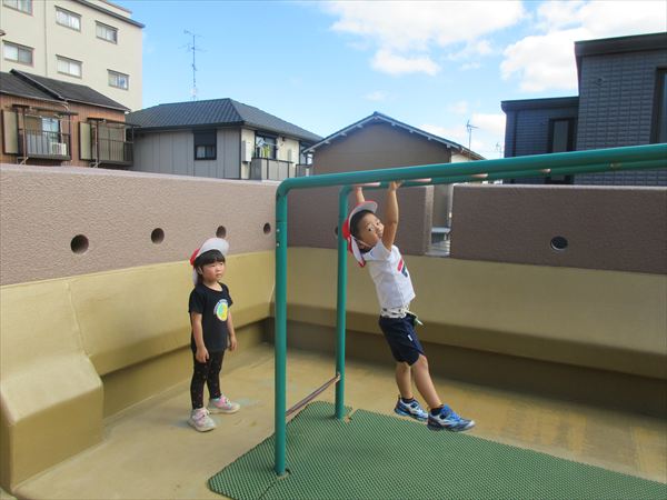 運動会の後に園庭に出ると、運動会ごっこを楽しむ姿が見られました!にじ組のサーキットで見た、うんていや、鉄棒に挑戦していました!