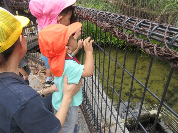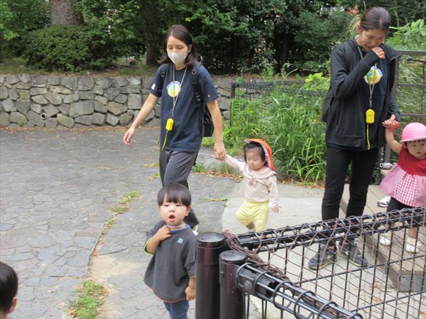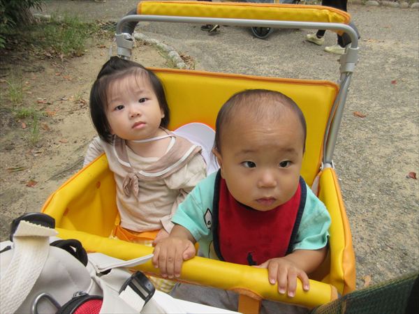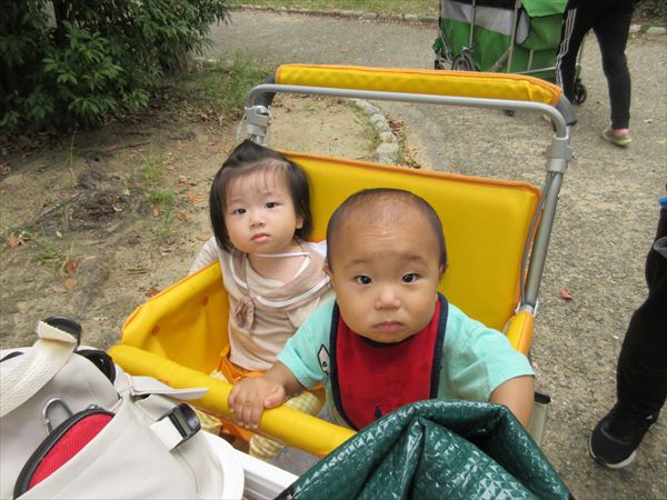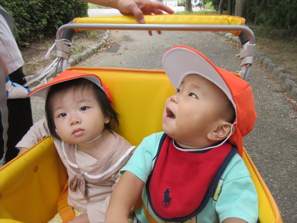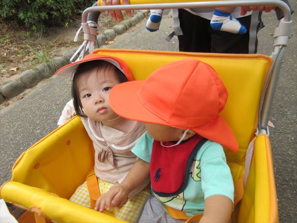 初めてのお出かけにワクワクの子どもたち。バギーの中から周囲の様子をよく見て、車の方に手を振ったり、指差ししながら見つけたものを保育者に教えてくれたりして楽しんでいましたよ♪