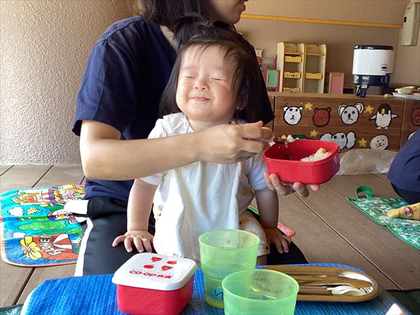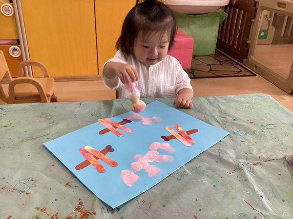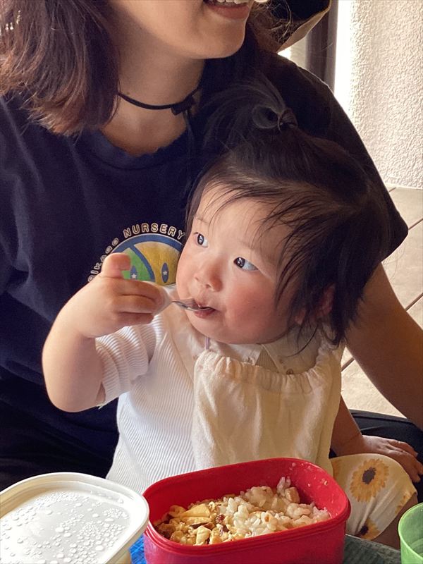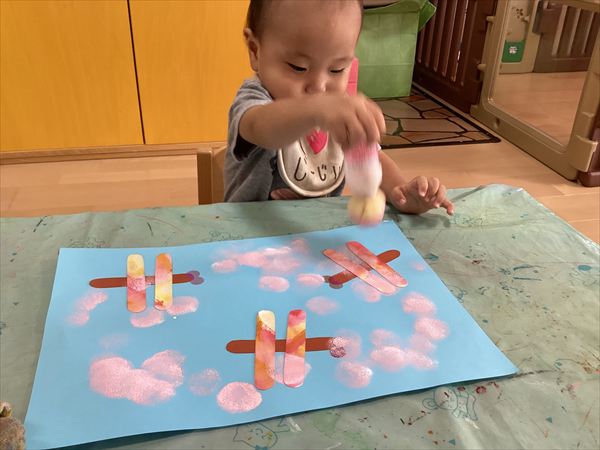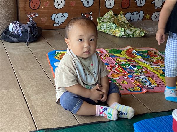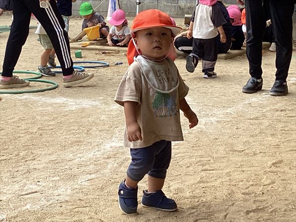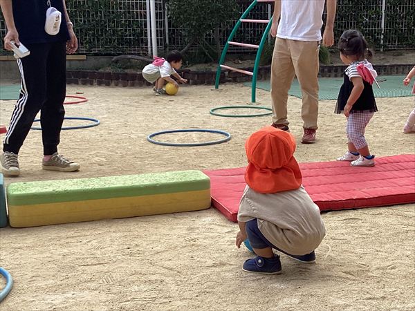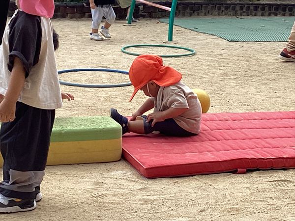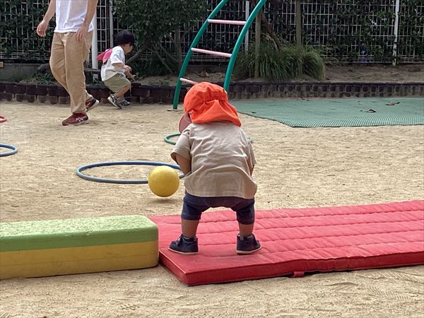 園庭にマットを見つけてゆっくりと乗り、足踏みしたり座ったりして柔らかさを楽しんでいます。砂場でも友だちがどんな遊び方をしているのか観察しているようです。好奇心旺盛なおひさま組の子どもたちです。