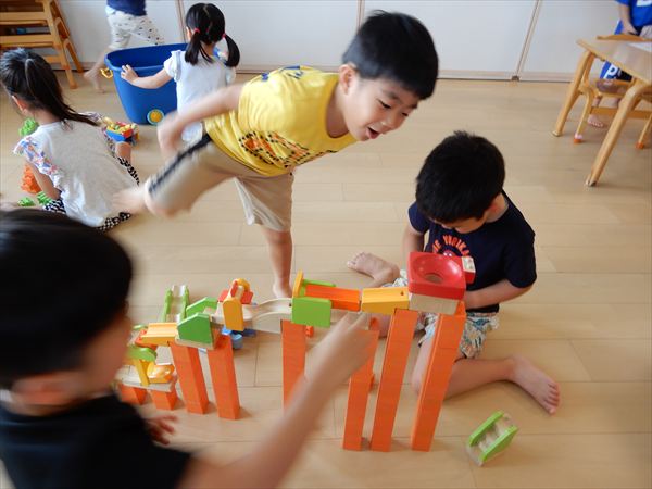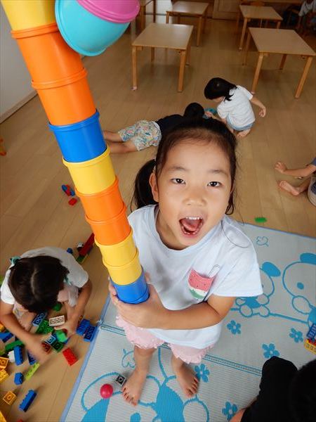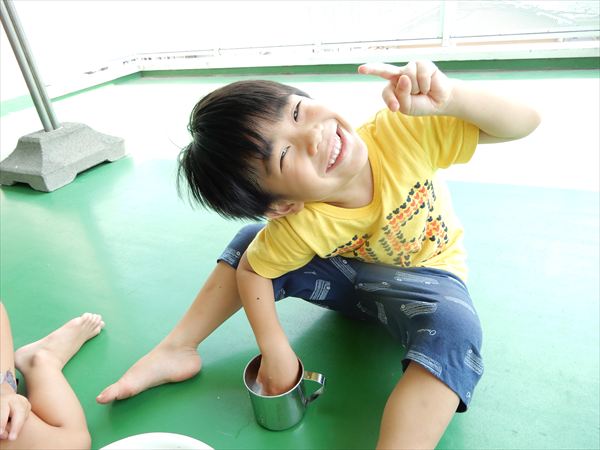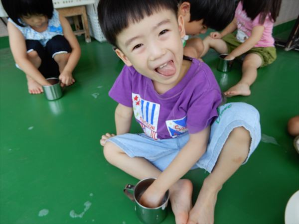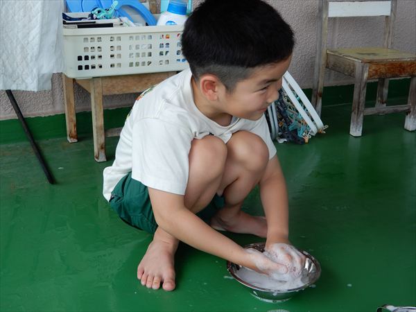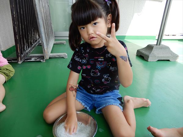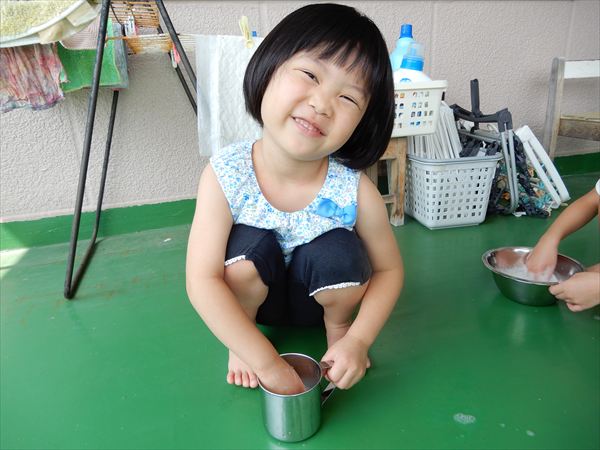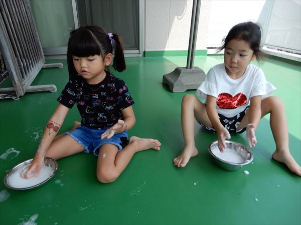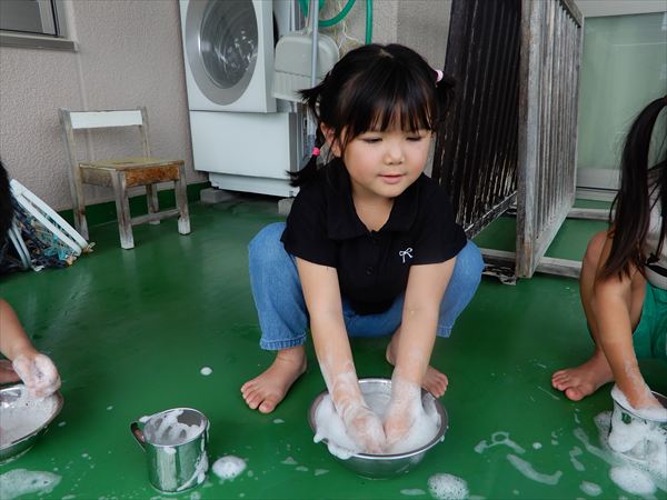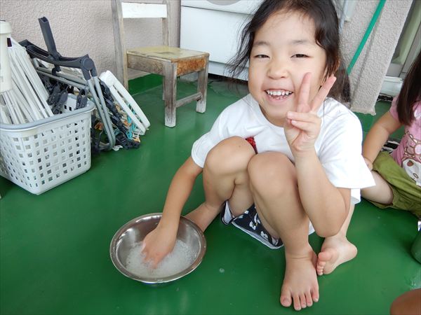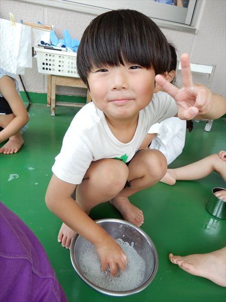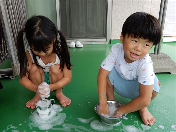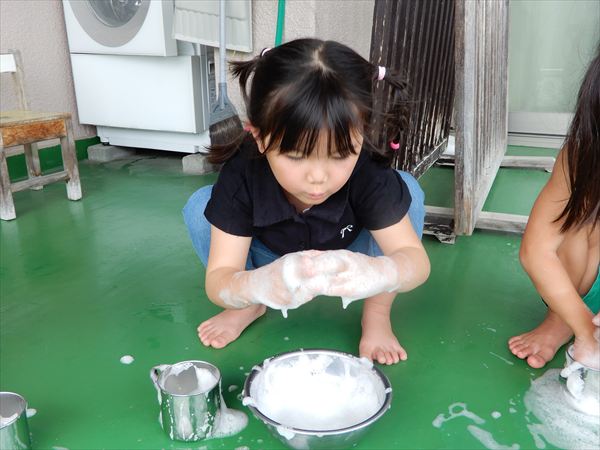プール遊びで大人気だった石鹸で泡遊びをしました!シャカシャカと泡を作って泡の感触を楽しんでいましたよ♪