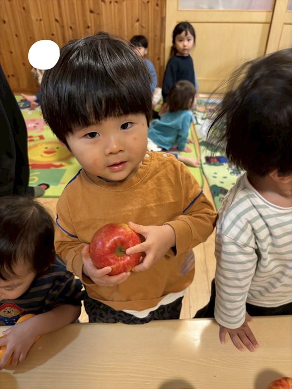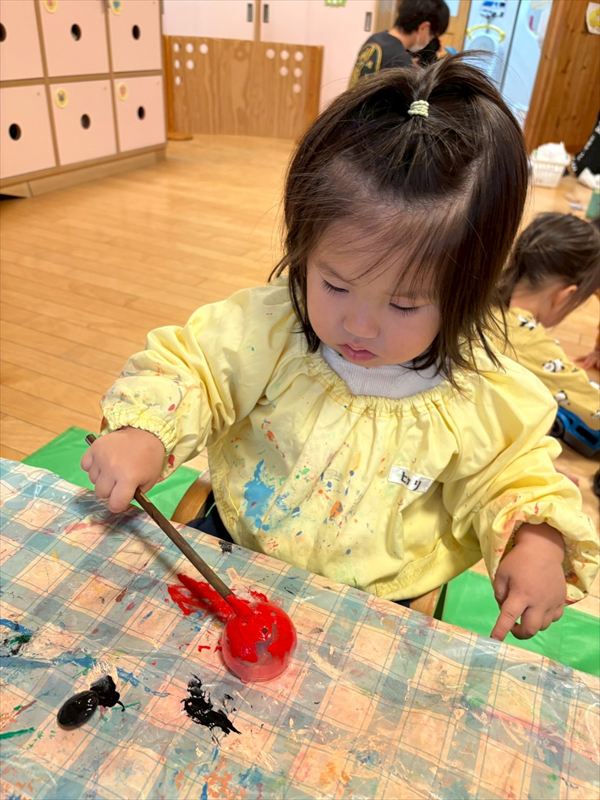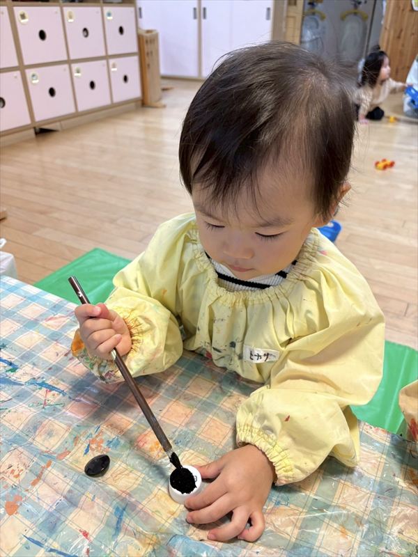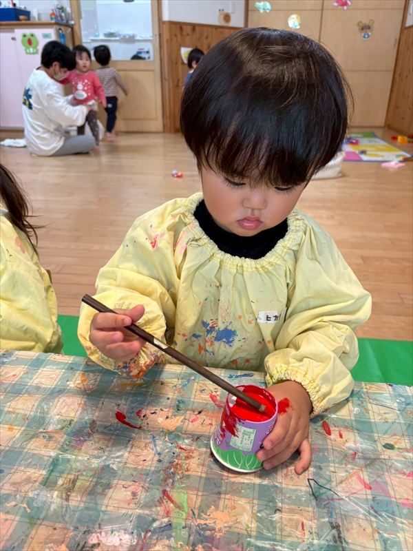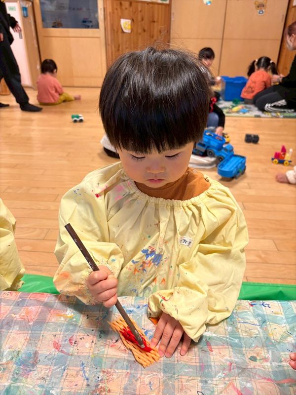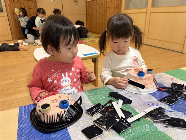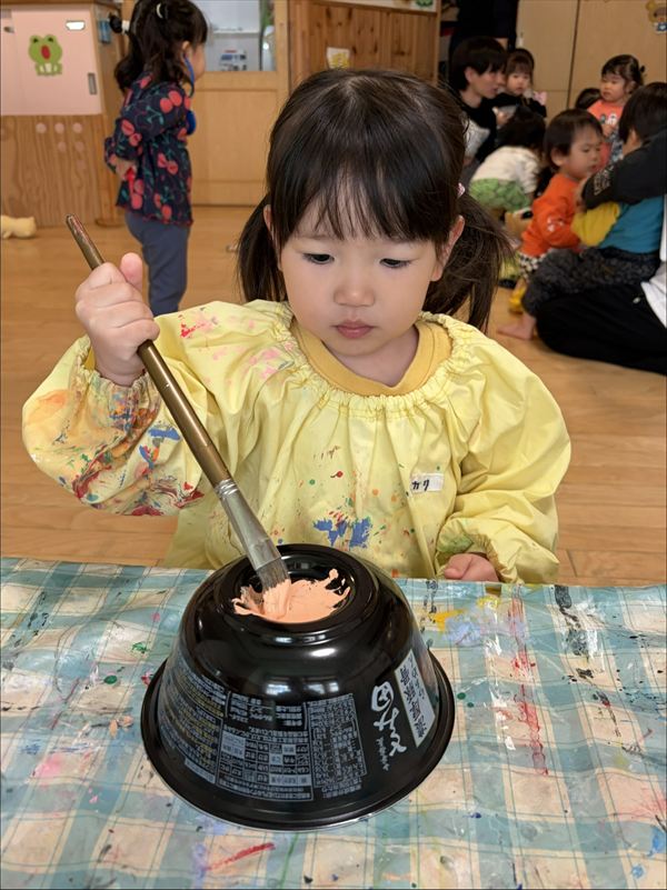 絵本「かおかおどんなかお」をテーマに、かわいいお顔を作りました。絵の具や様々な廃材に興味を持ちながら制作遊びを楽しんでいました!(^^)