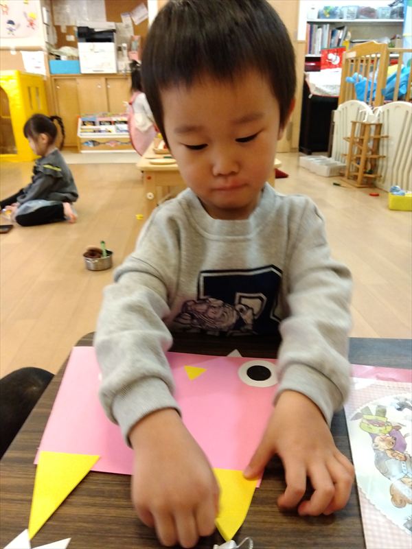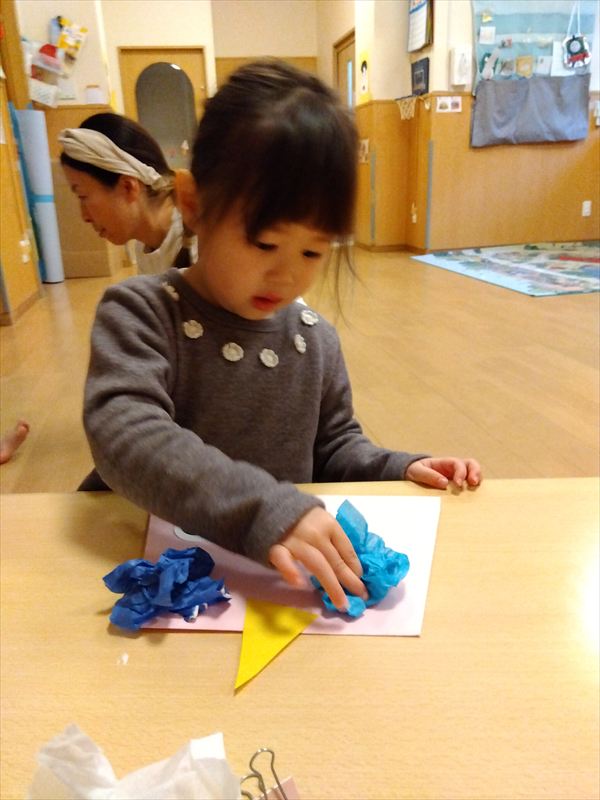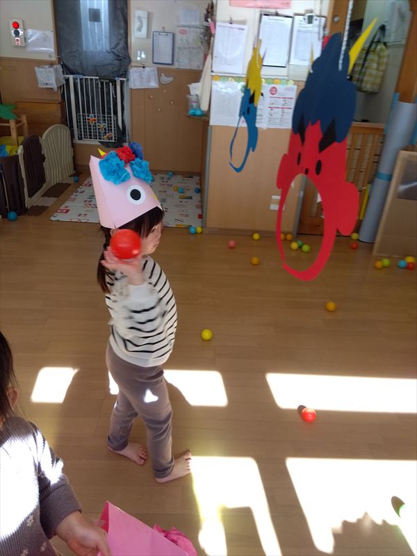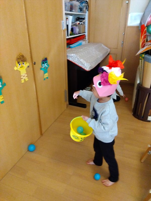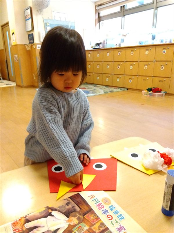 正月遊びとして、カルタ・福笑い・コマを用意しました。普段あまりやらない遊びに子どもたちは興味津々。福笑いが一番人気でした!