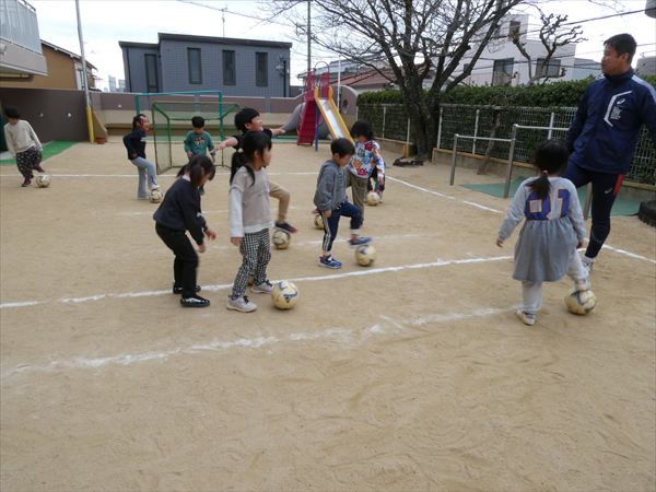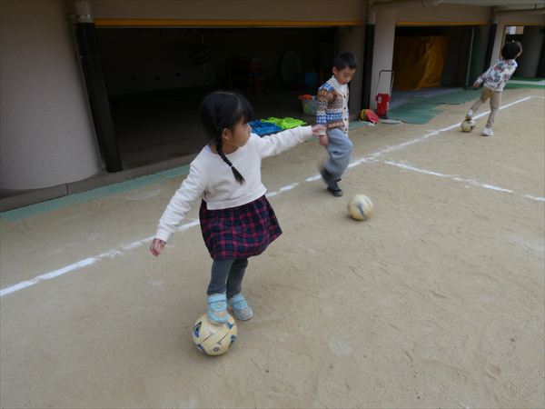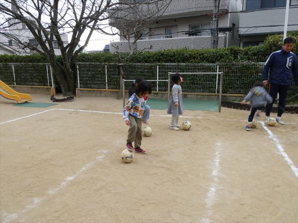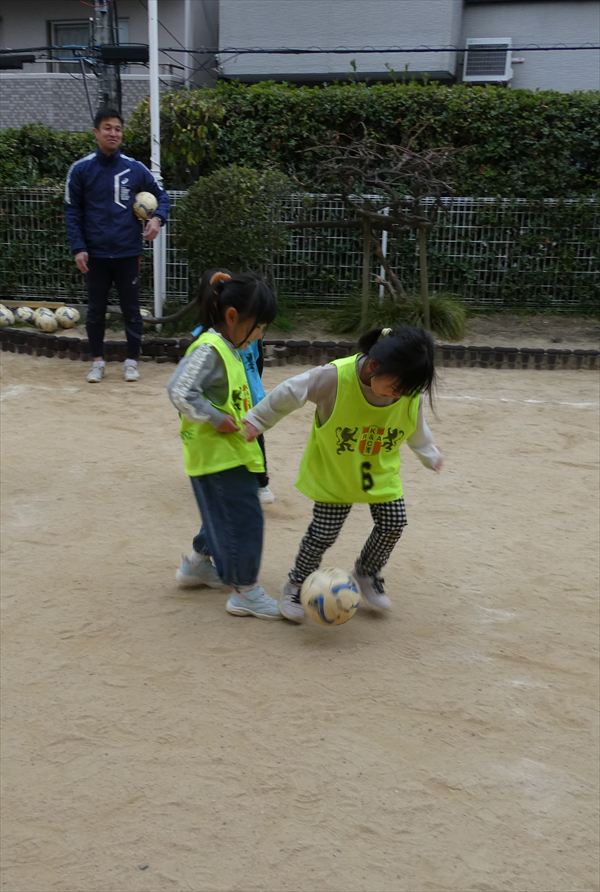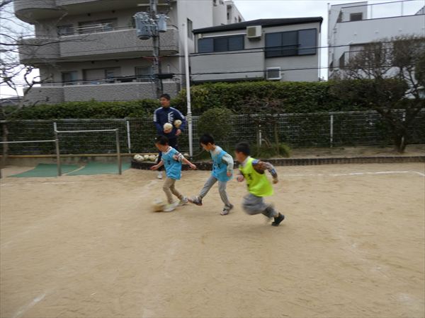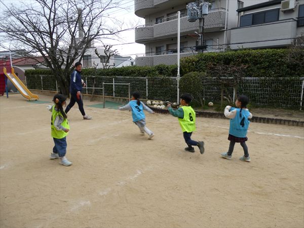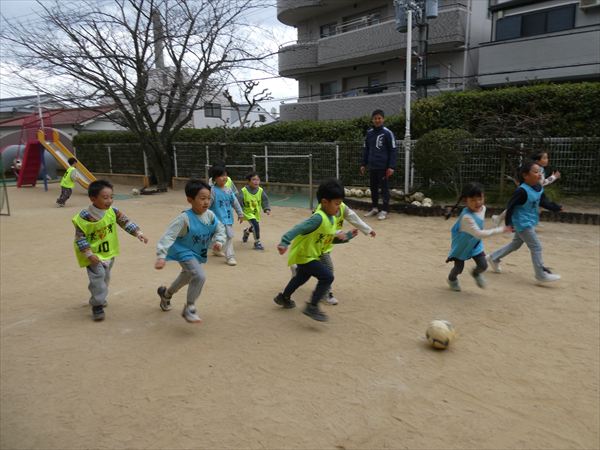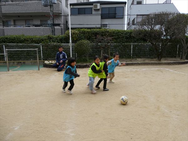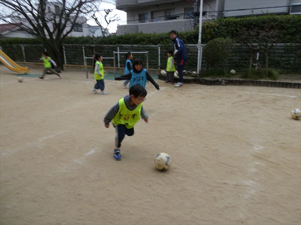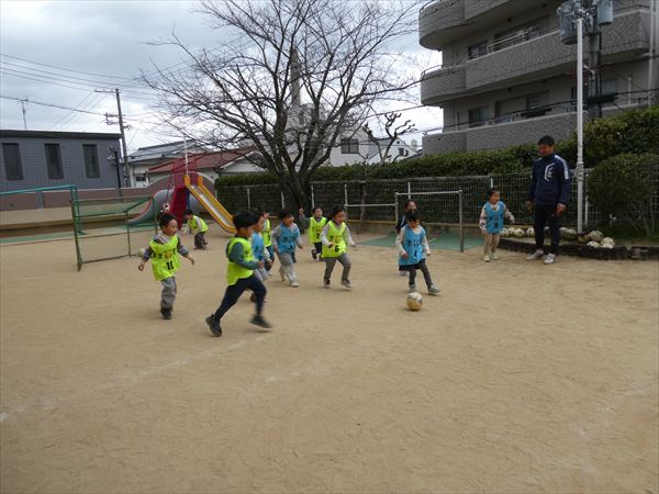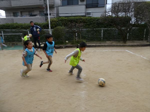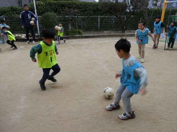 ボールを蹴るのもパスを渡すのもずいぶん上手になり、この日は常に接戦を繰り広げていました!!同じチームで声を掛け合ったり応援し合ったりしながら楽しんでいます(^^)