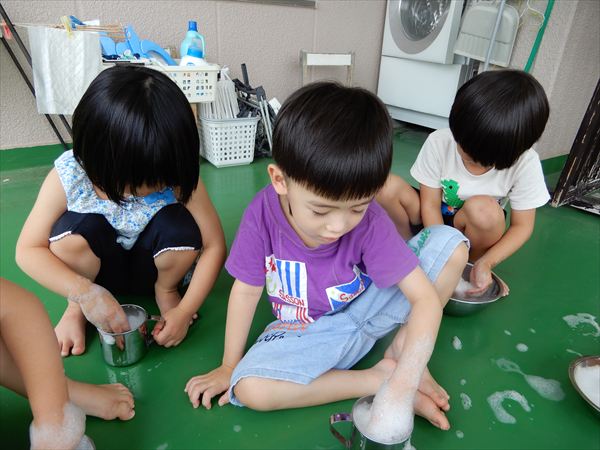 プール遊びで大人気だった石鹸で泡遊びをしました!シャカシャカと泡を作って泡の感触を楽しんでいましたよ♪