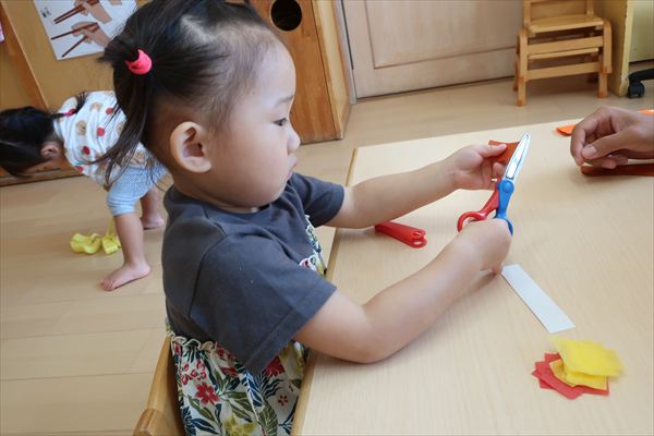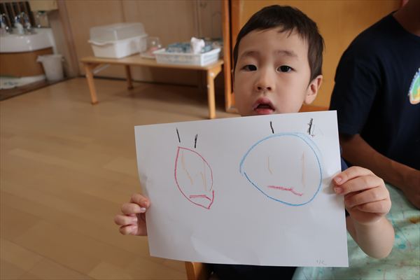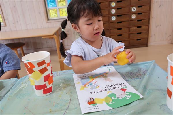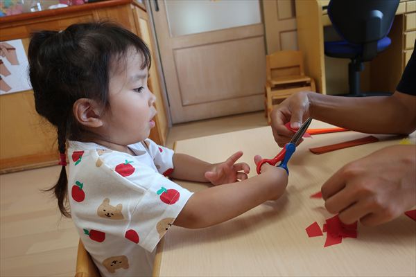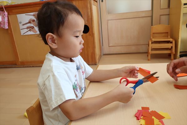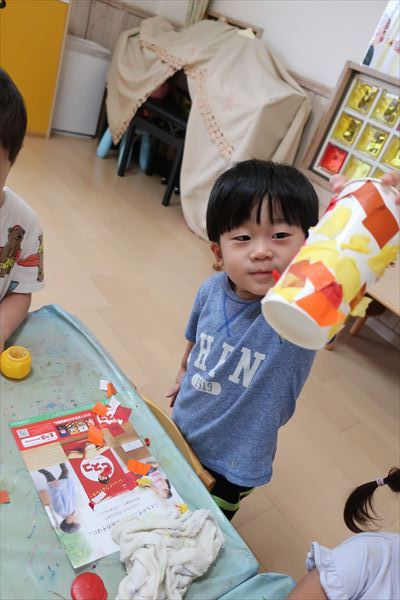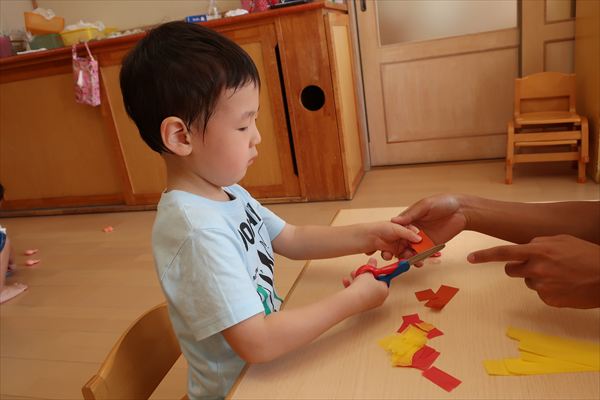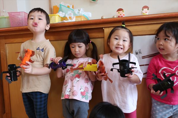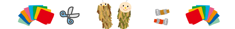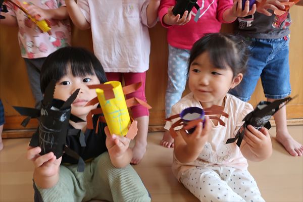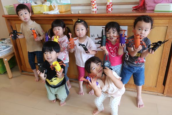 ハサミやのり、クレパスを使うことに慣れてきた子どもたち。みのむし、カブトムシ、クワガタ、運動会の旗を作りました!