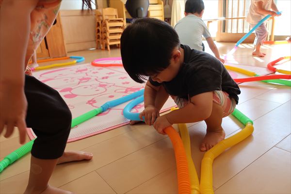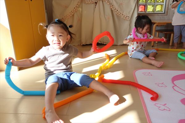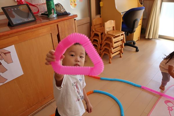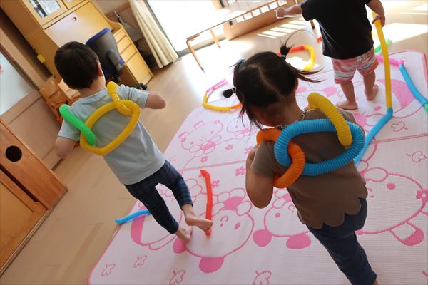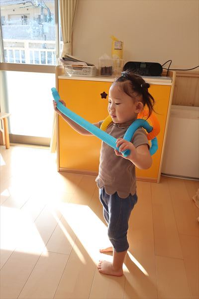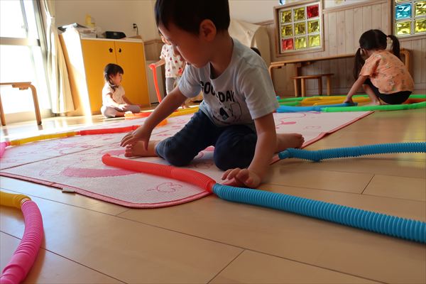 カラーチューブを手指で伸ばして~くっつけて~大きなプールや三角、輪っかを作り、背中に背負って「ランドセルだよ!」と友だちとイメージを共有してごっこあそびを楽しんでいました
