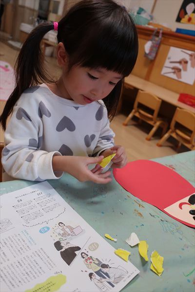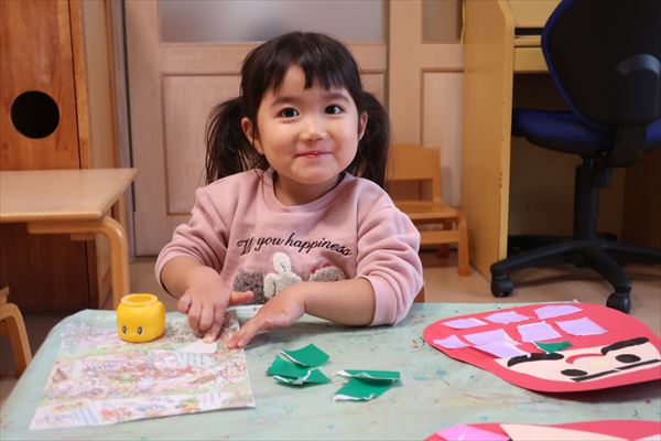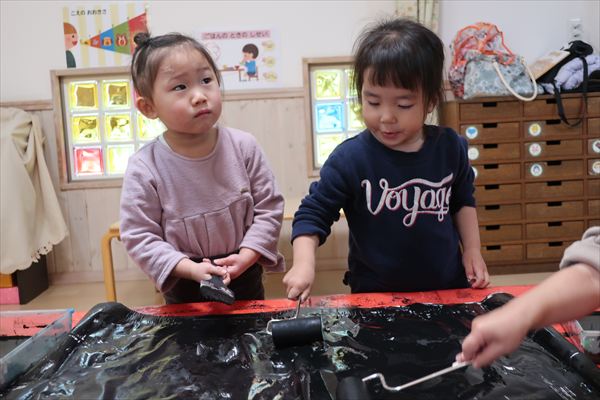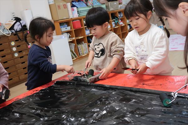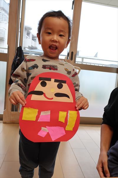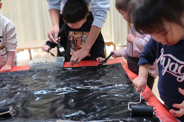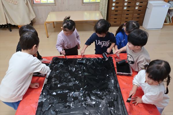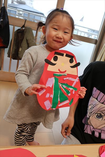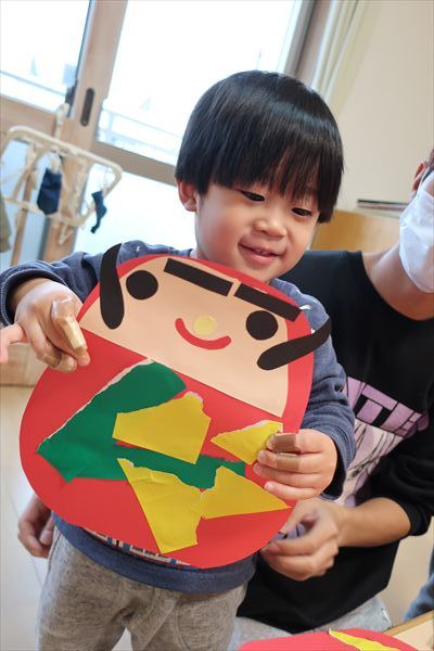 のり、折紙、色画用紙を使って「だるま」を作ったよ!それから、発表会の劇あそび「くれよんのくろくん」で使う壁面をお友だちと黒い絵の具、刷毛やローラーを使ってたくさん塗りました。