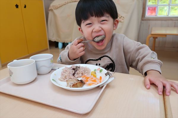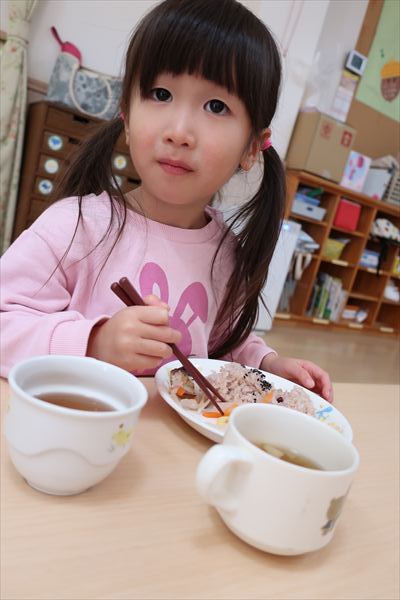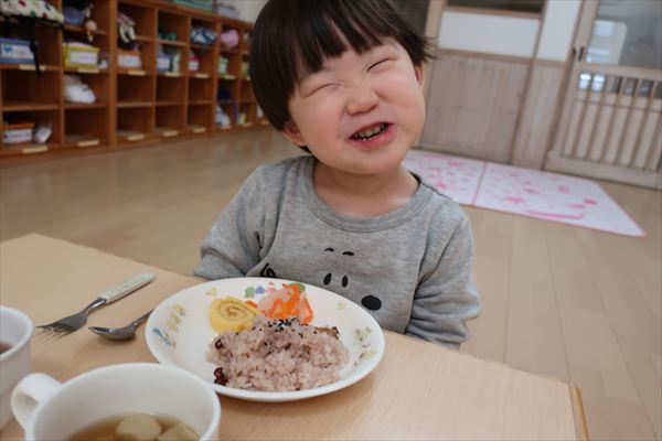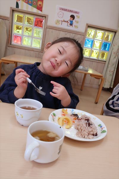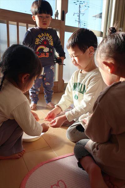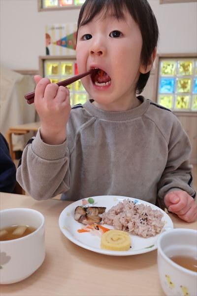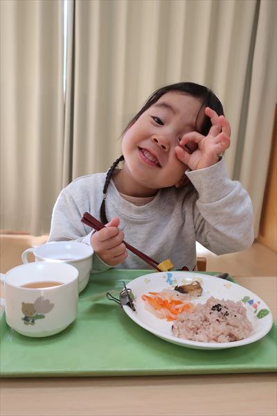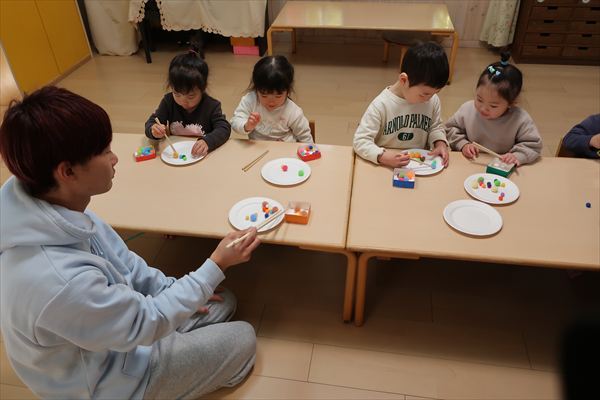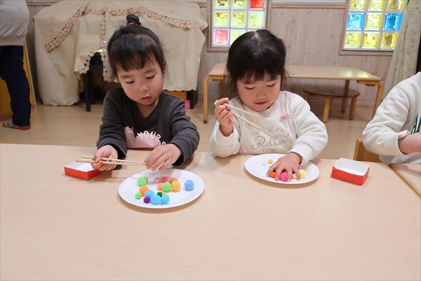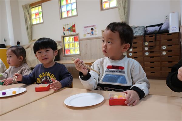 おせち料理を食べたよ!今年も元気いっぱいに過ごしましょうね! 進級に向けて給食の先生と一緒に箸の正しい持ち方、つかみ方をあそびながらチャレンジしました!初めてのお友だちも「できたよ」「もう1回する~」と楽しみました!