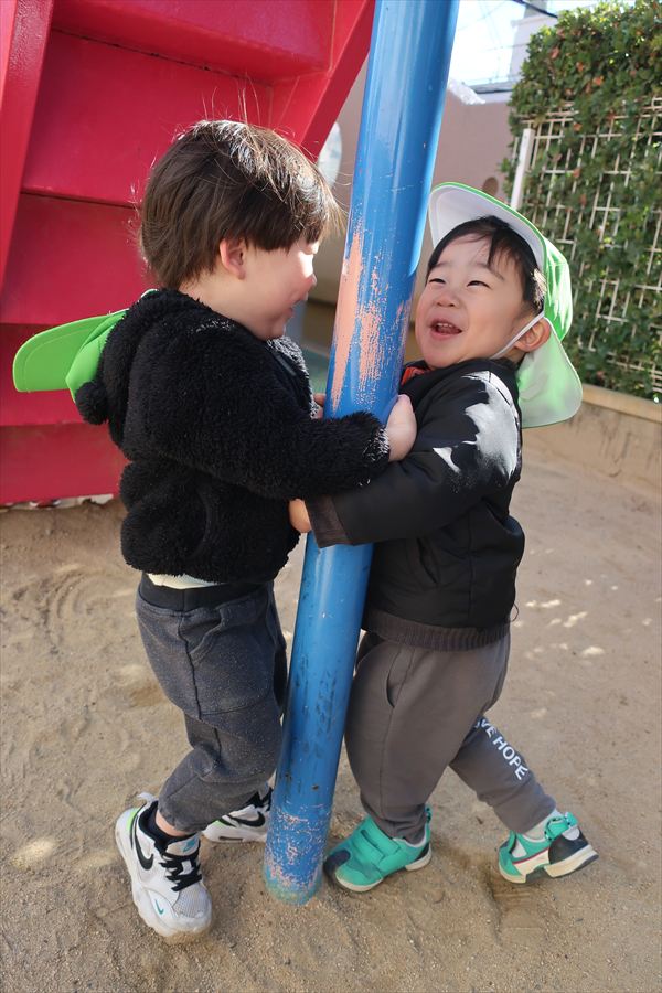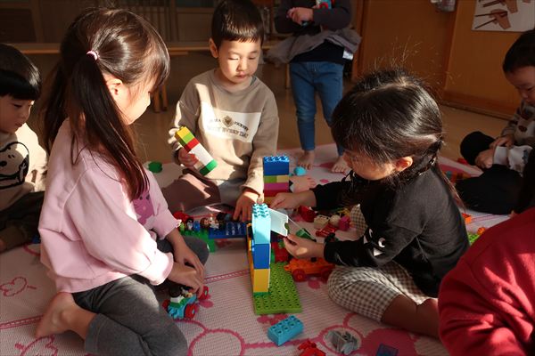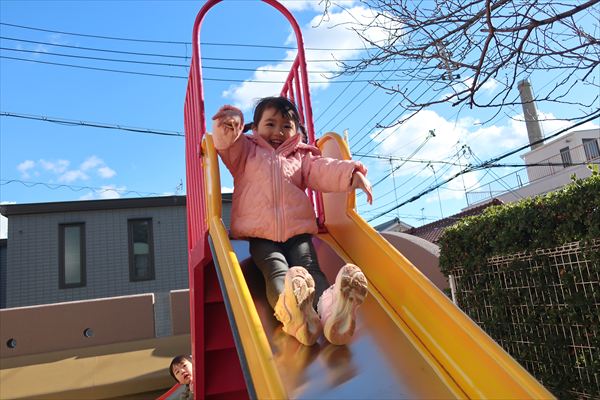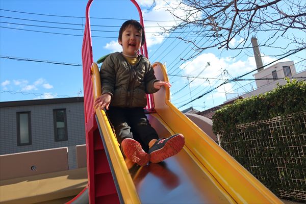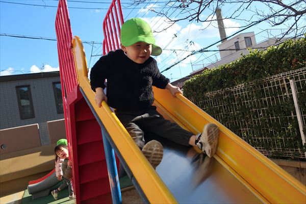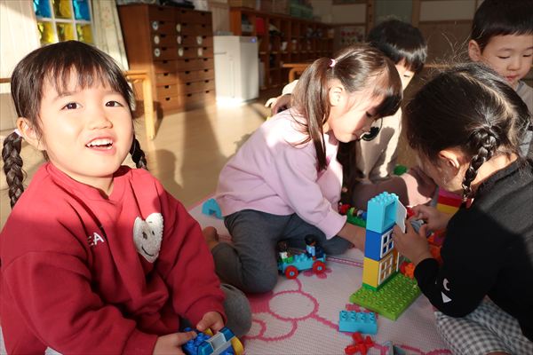 大きいすべり台、ブランコも上手になってきました。レゴブロックでは大きなお家を組み立ててごっこあそび!広い空間でお友だちとトンネル~!