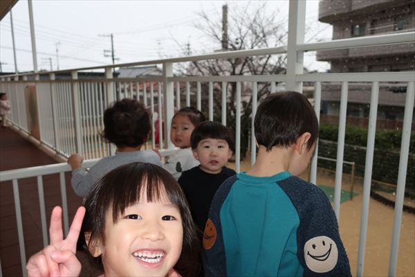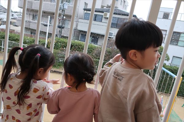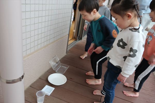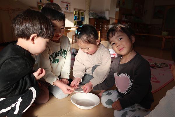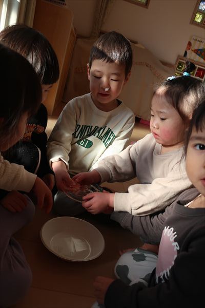 窓を見て「やったー!雪~」・・・テラスに出て大喜びでした(^^)/水を器に入れて、翌朝氷ができていましたよ♪「つめたいね!」氷の感触を楽しみました!