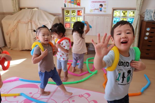 カラーチューブを手指で伸ばして~くっつけて~大きなプールや三角、輪っかを作り、背中に背負って「ランドセルだよ!」と友だちとイメージを共有してごっこあそびを楽しんでいました