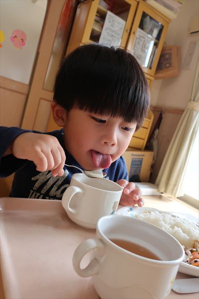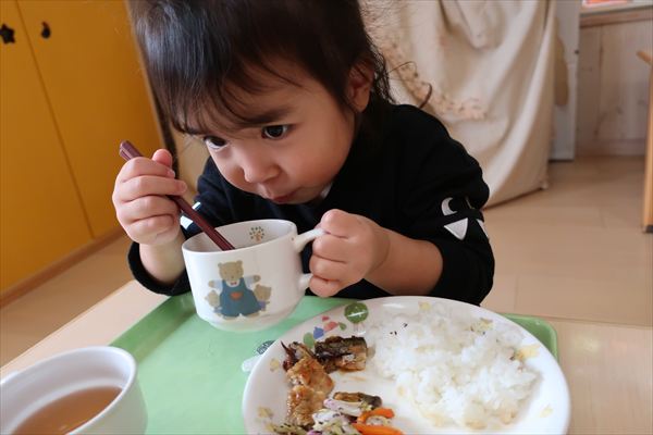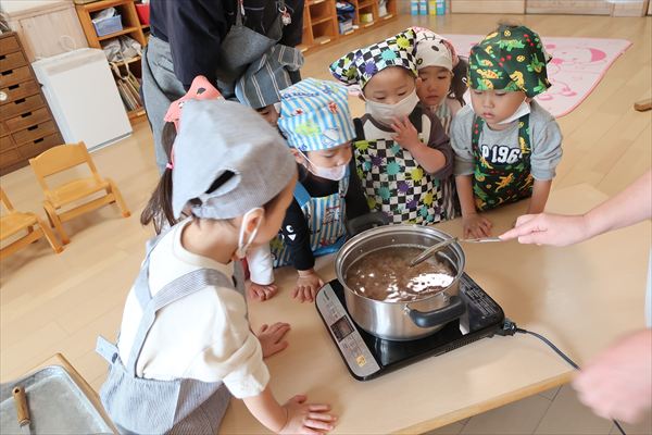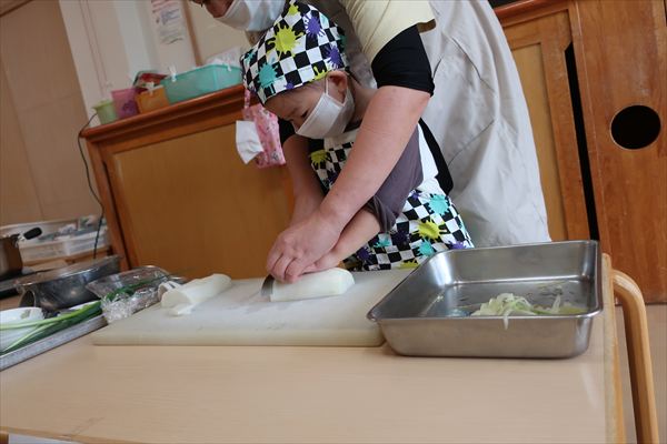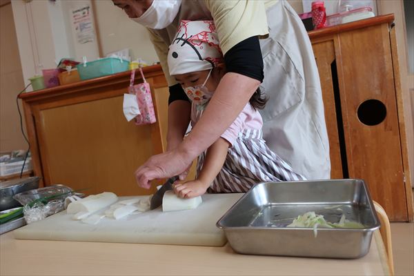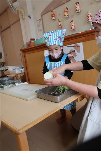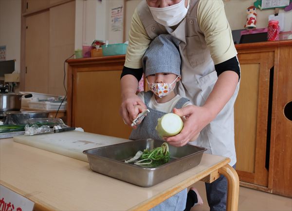 初めてピーラーや包丁を保育者と一緒に使って「大根とネギのすまし汁」を作りました。かつお節から出汁を取り「おいしい~(^^♪」と大満足!