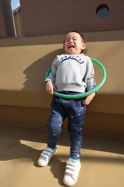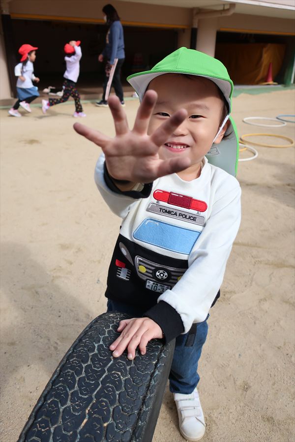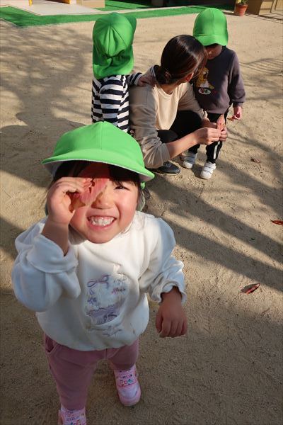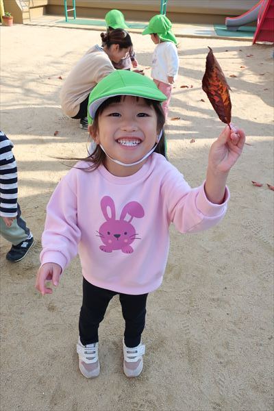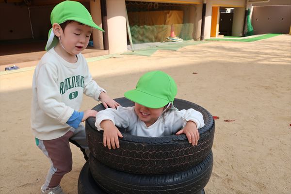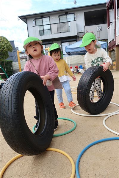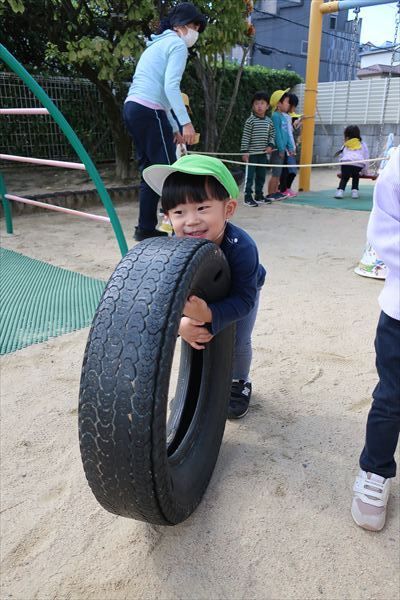 ★大好きな園庭で葉っぱオバケごっこをしたよ!重たいタイヤ運びもおもしろいね!