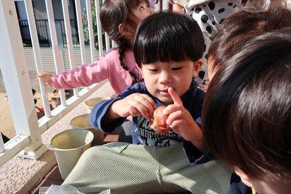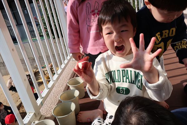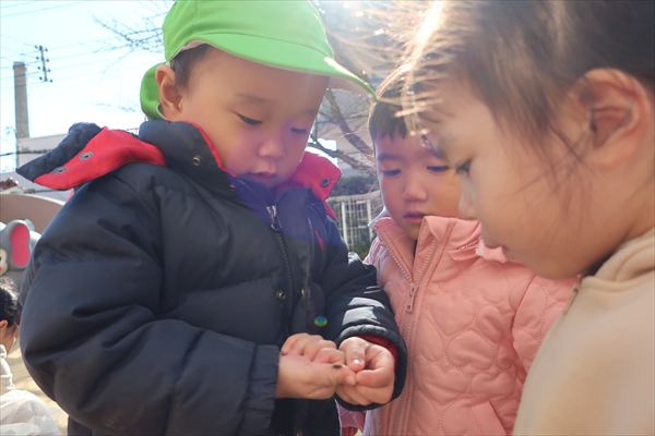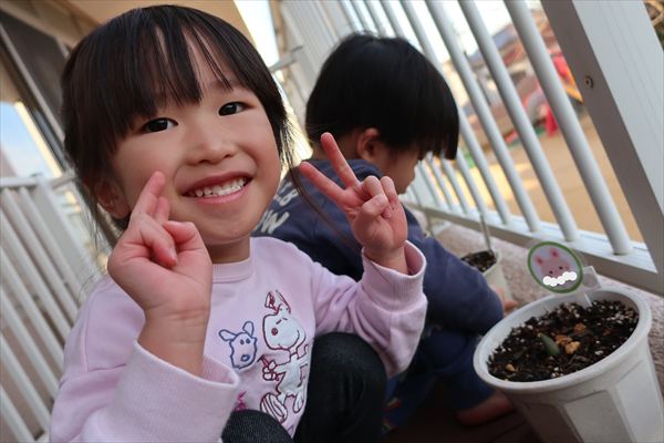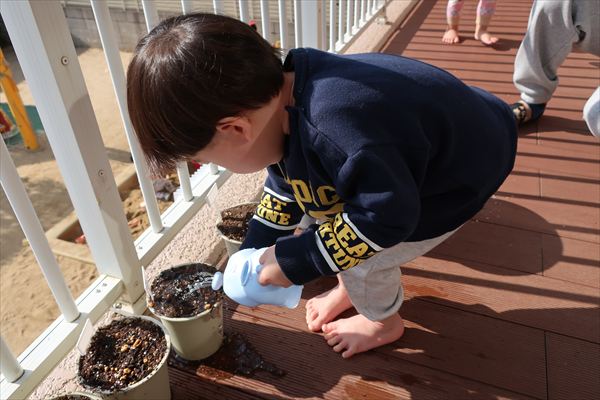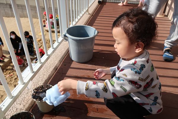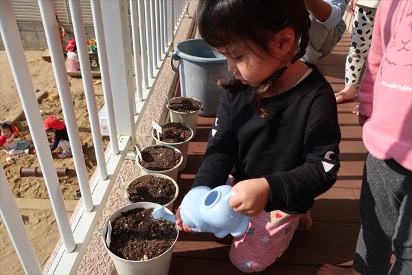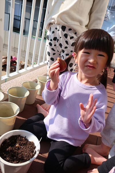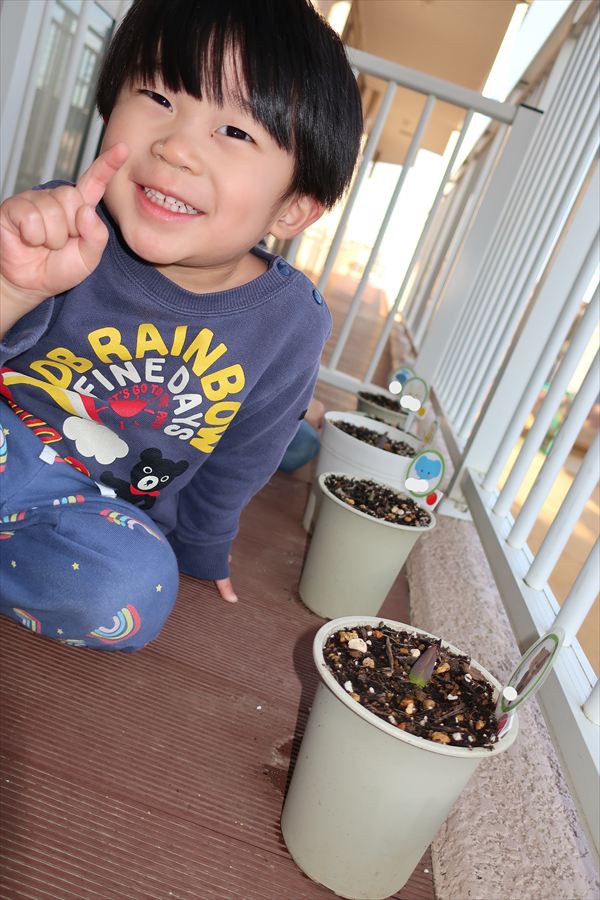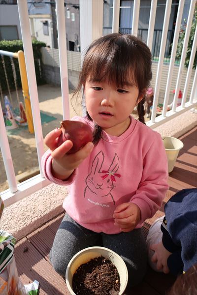 11月下旬に好きな色の球根を一人ひとつずつ植木鉢に植えました。栗のような形や重みに興味津々な様子です♪水やりするのも大好きな子どもたち。12月下旬には小さな芽が出て喜んでいます!春が楽しみです