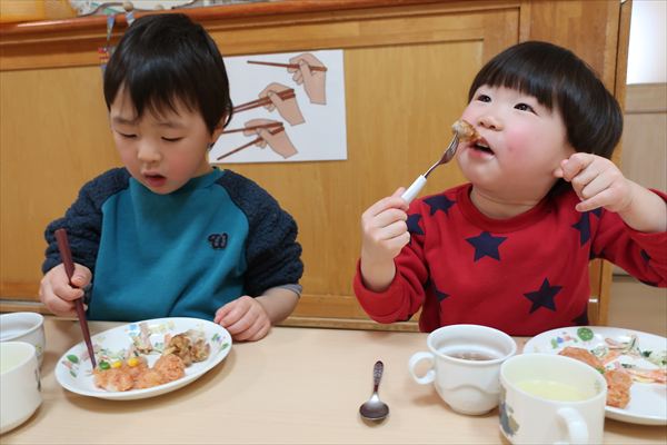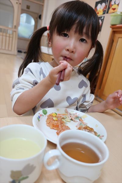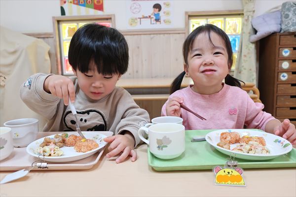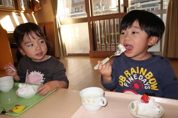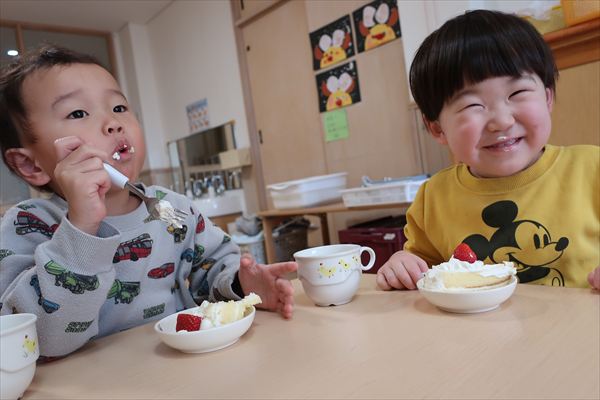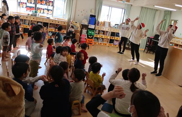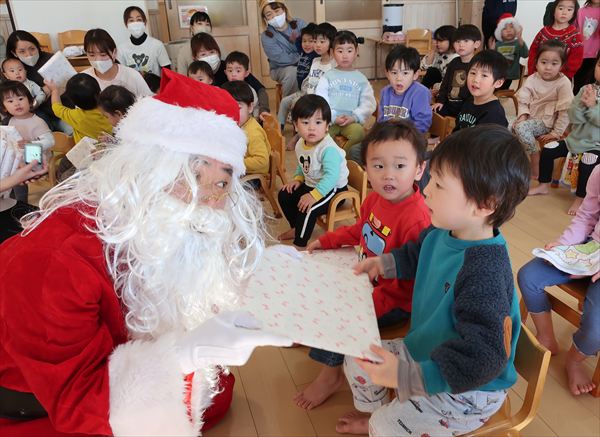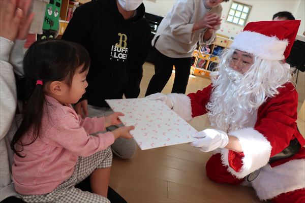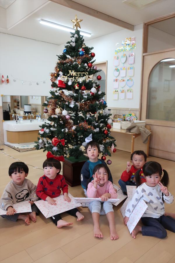 パネルシアター「森のクリスマス」を見たり、クリスマス曲でダンスや歌をみんなで楽しみました!サンタさん登場で、ドキドキして先生から離れられないお友だちもいましたがプレゼントをもらって「ありがとう!」が言えました(*^^*)給食&おやつもクリスマスのごちそうで「おいしい~!」