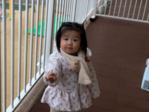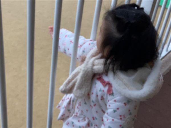 ☆雪が降ったよ!テラスの柵の間から腕をううんと伸ばして雪を触ろうとしていました。
