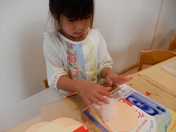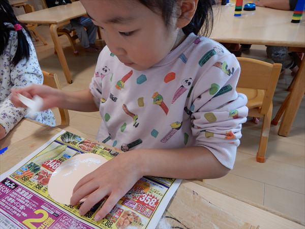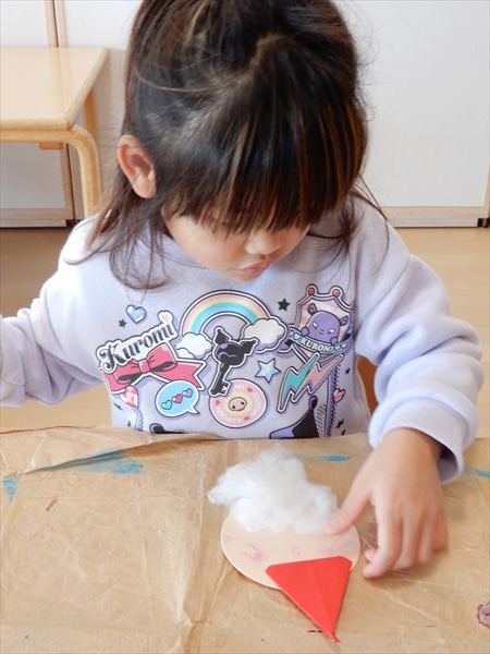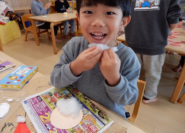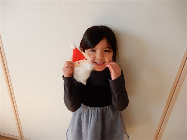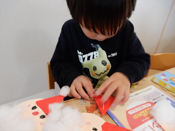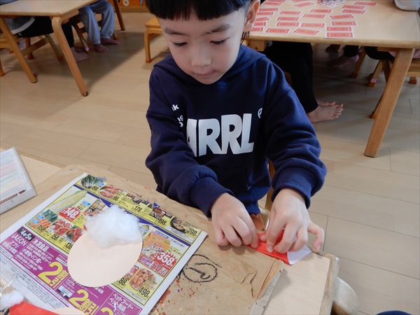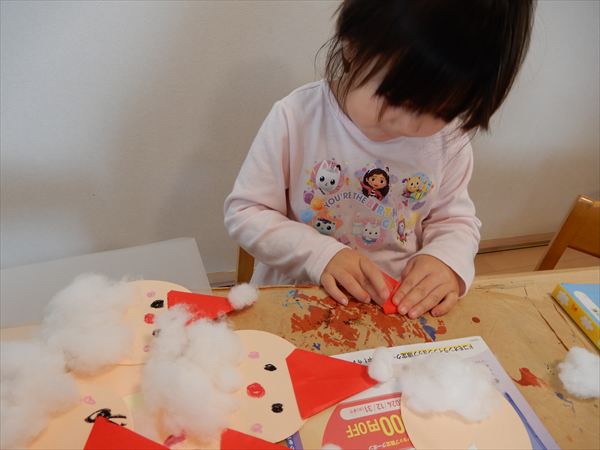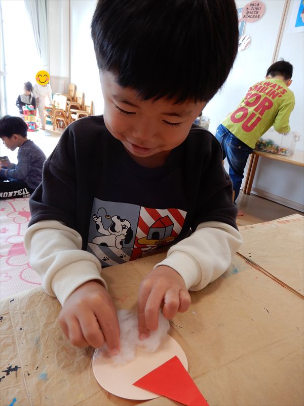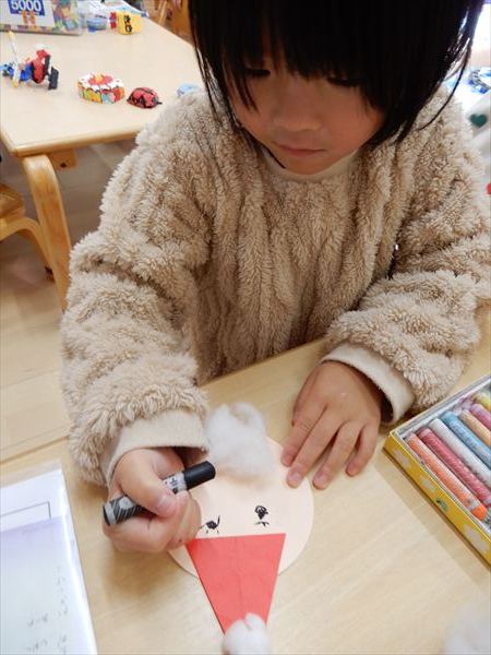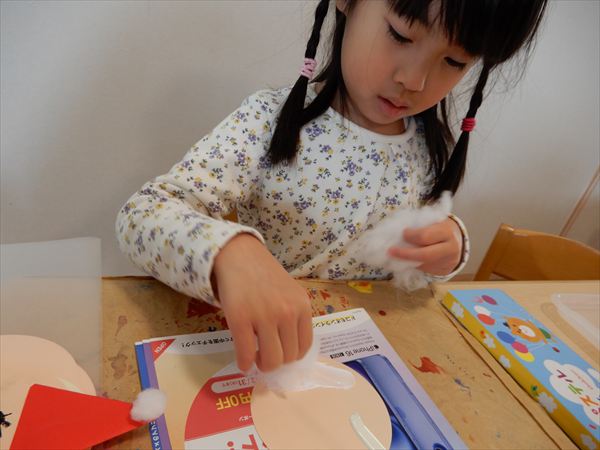 画用紙に綿をボンドで付けて、折り紙で帽子を折ってサンタさんを作っている様子です♪「サンタさんのおひげだー!」と大喜びで作っていました!