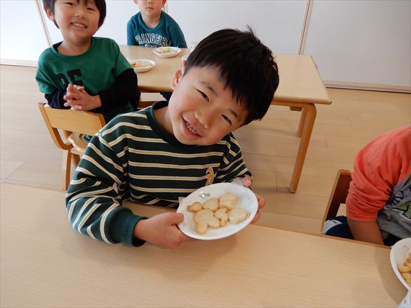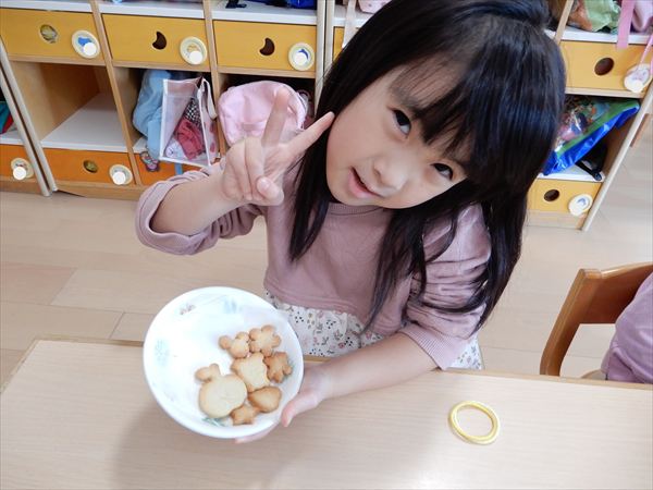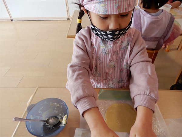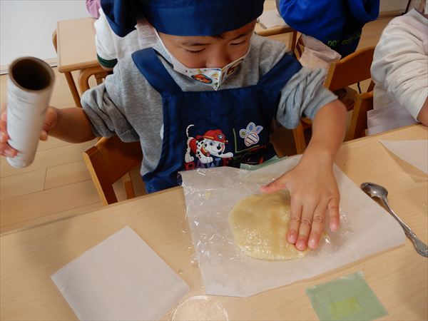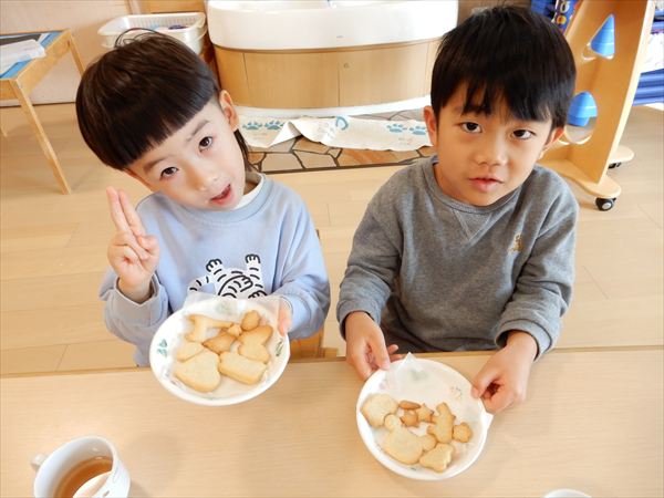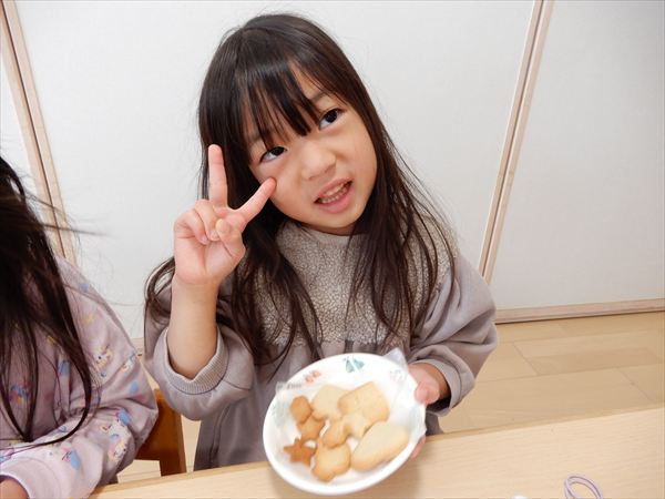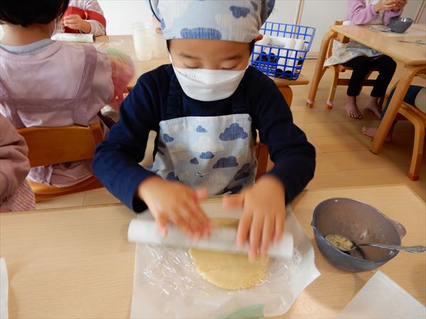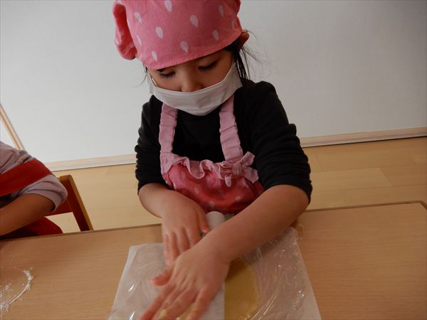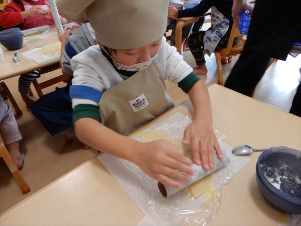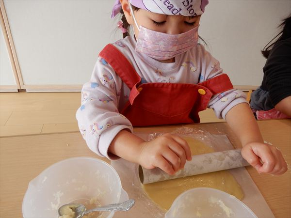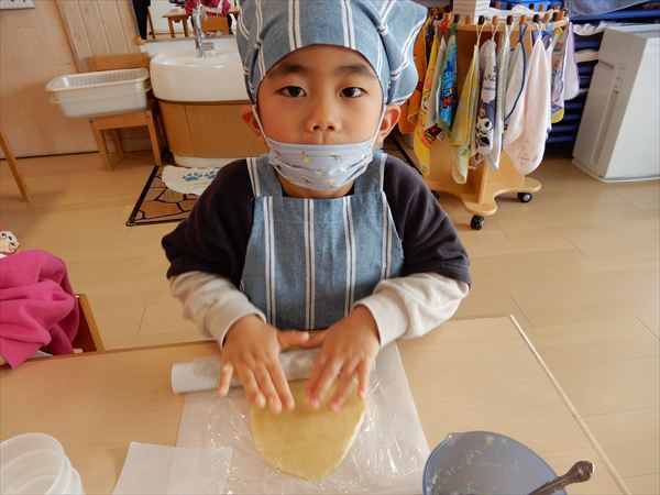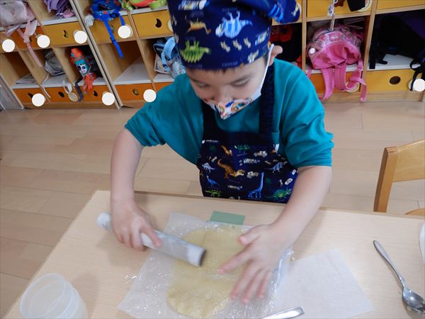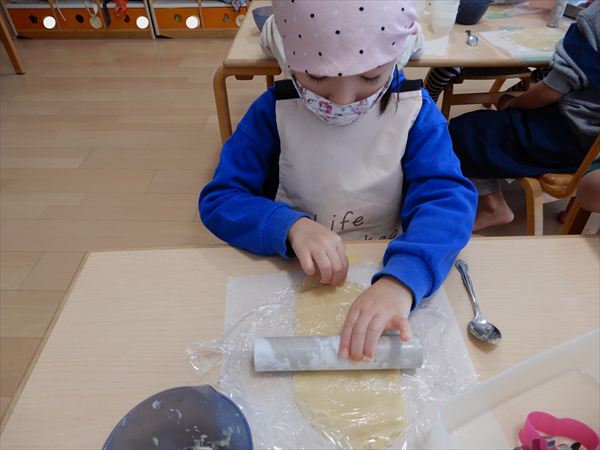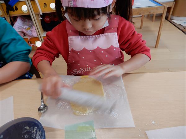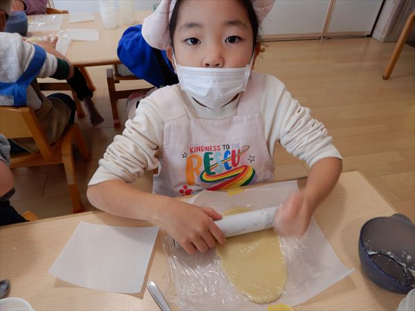 クッキングでプレーンクッキーを作りました!生地を捏ねて伸ばしたり、好きな形の型を選んで自分だけのクッキーが完成していましたよ!