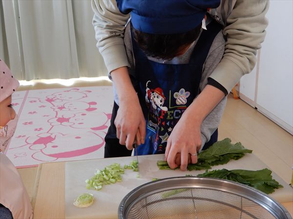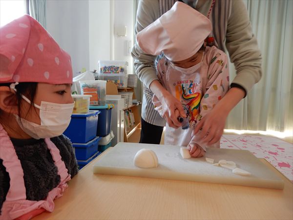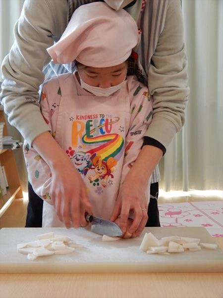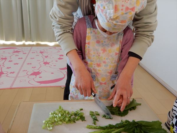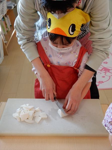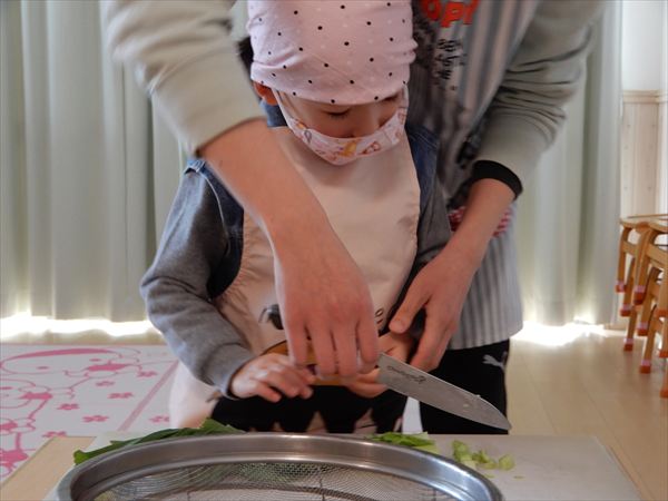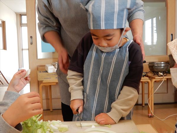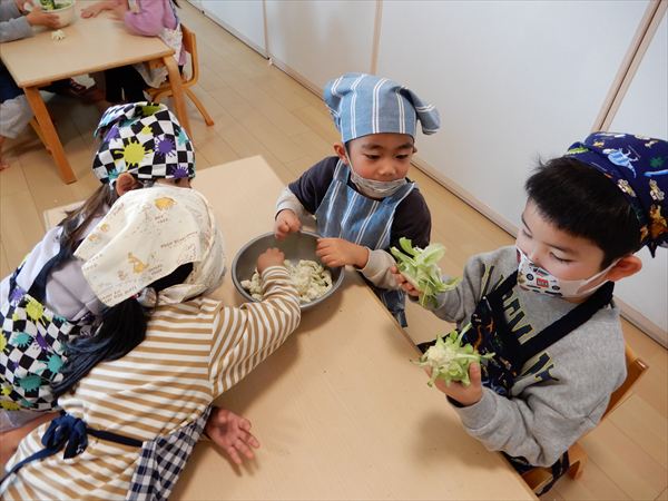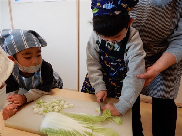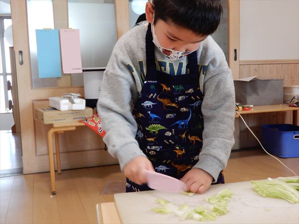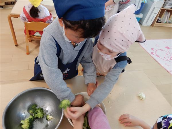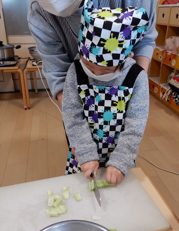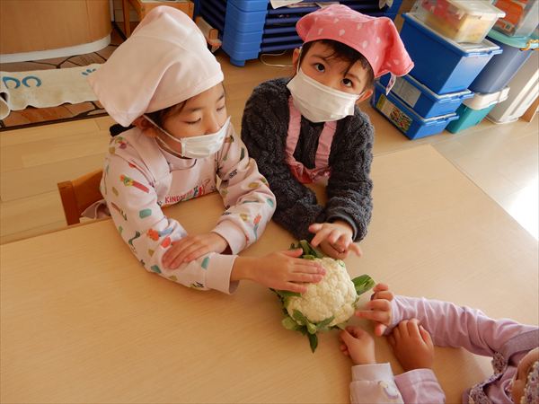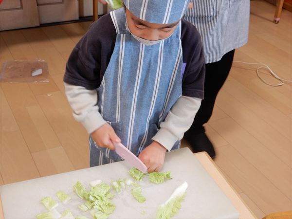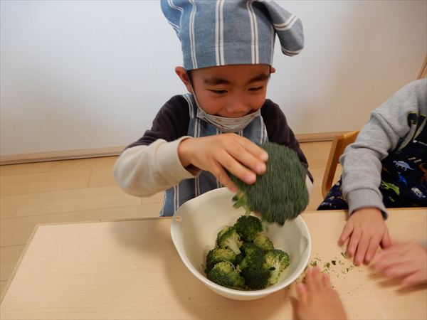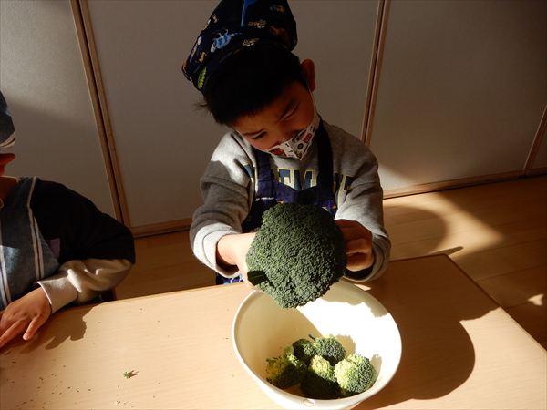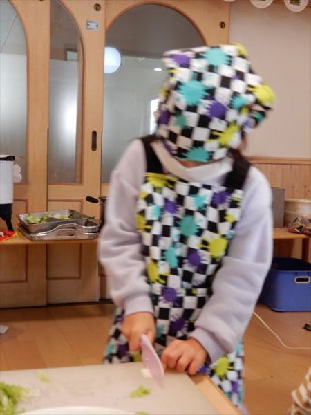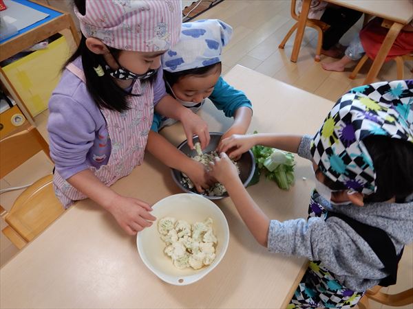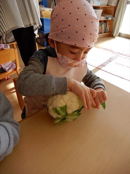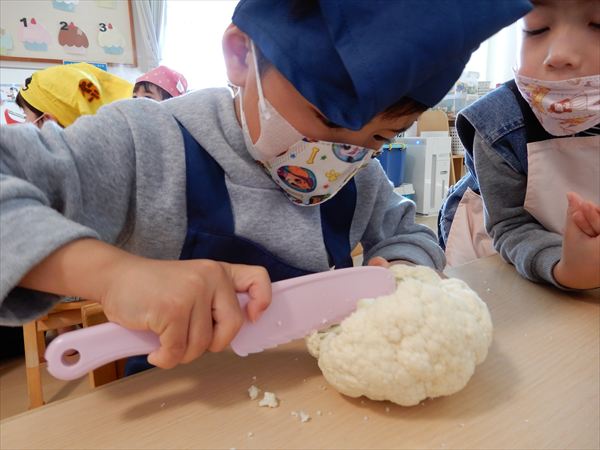 ブロッコリー、カリフラワー、かぶ、白菜を使ってクリームシチューを作っている様子です♪少しずつ包丁も一人で使えるようになってきて、真剣に作ることを楽しんでいました!