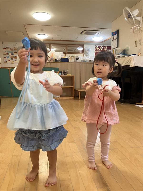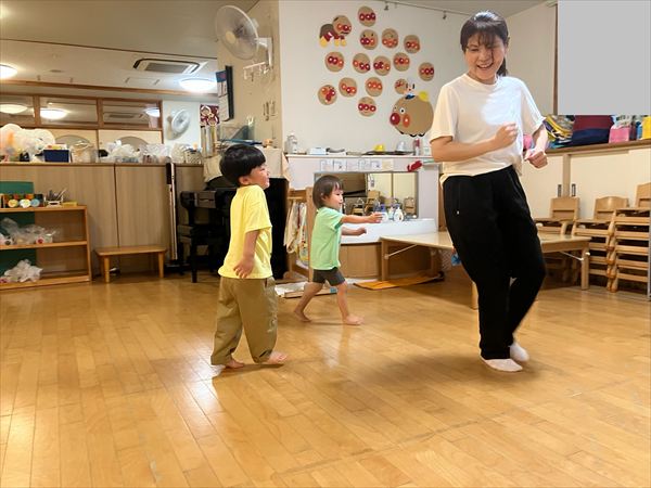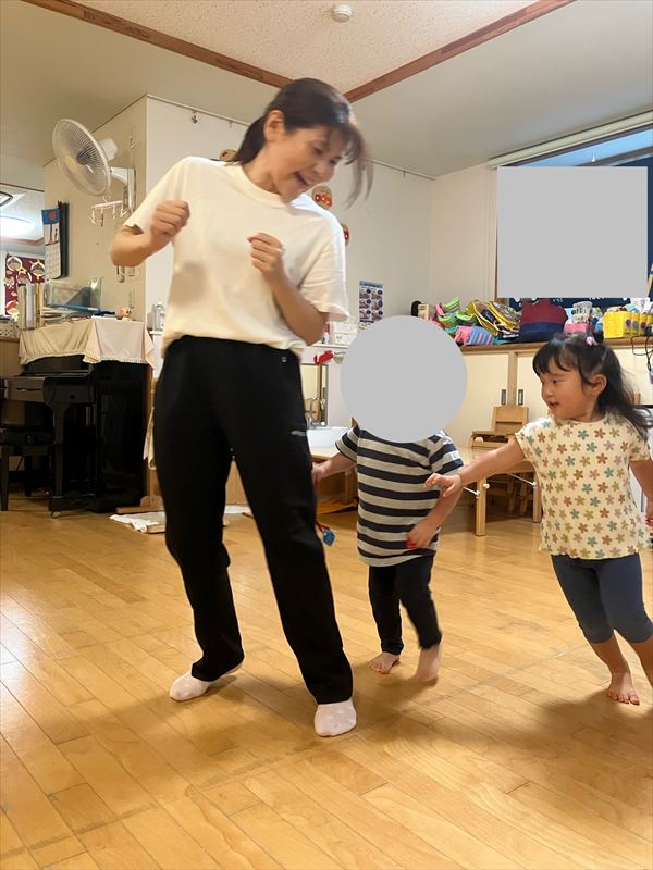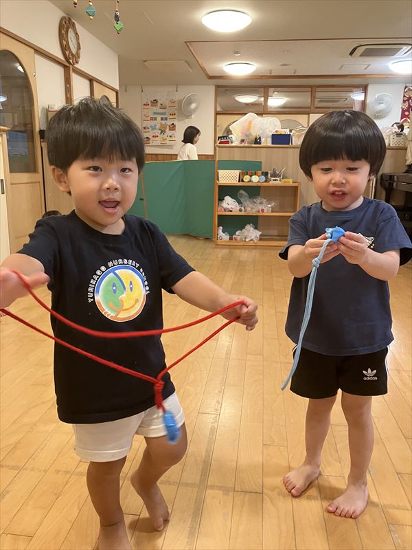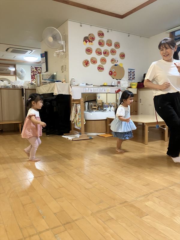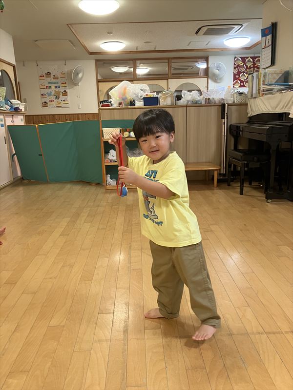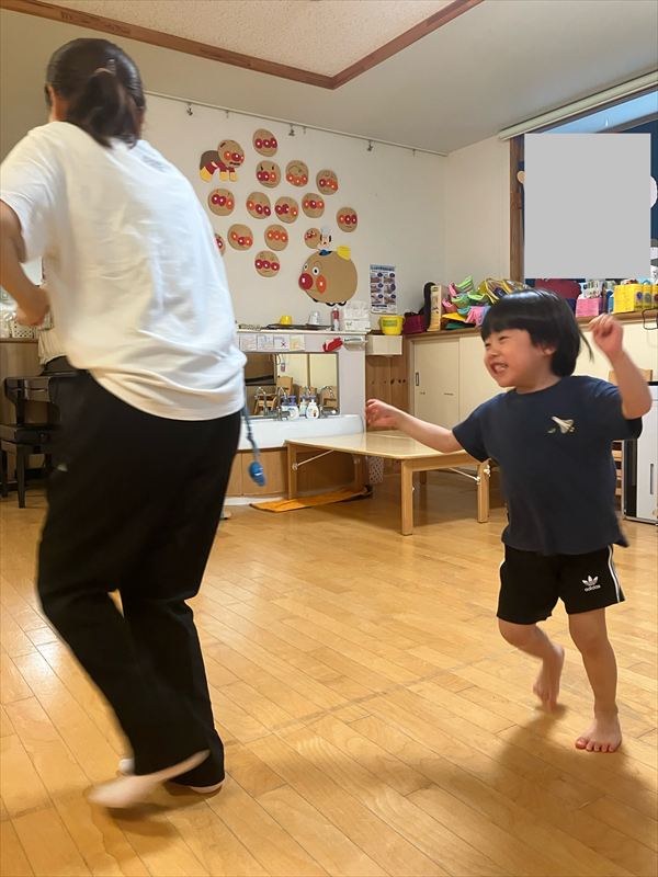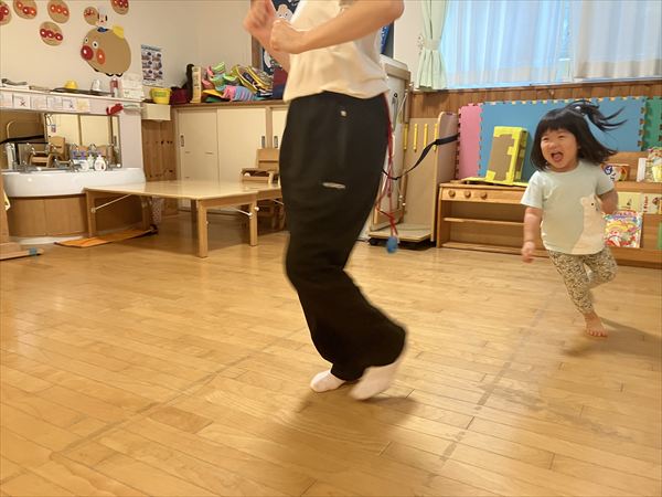 室内で先生のしっぽ取りをして遊びました!先生がしっぽをつけ、逃げるのを追いかけて取るのを楽しそうにしています(^^)