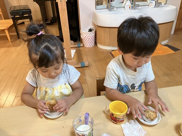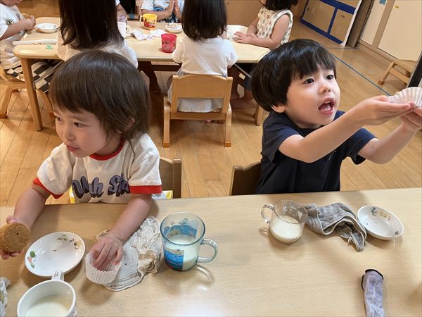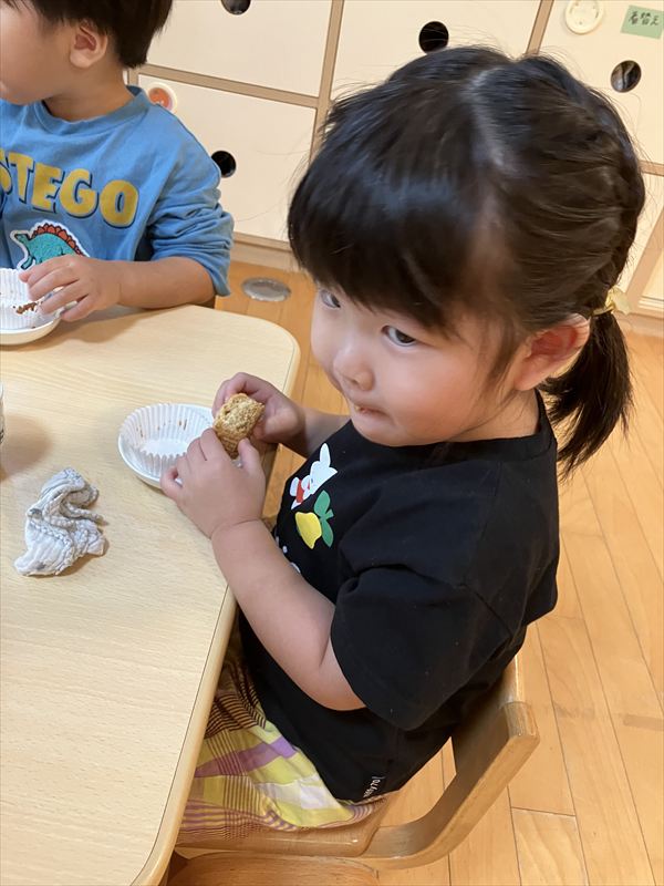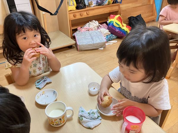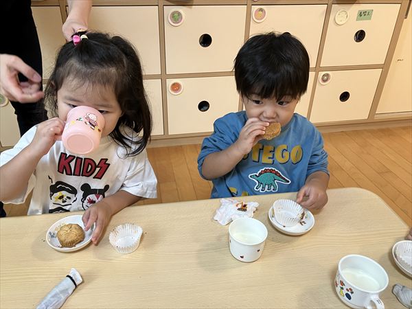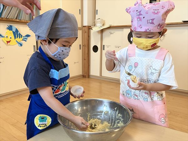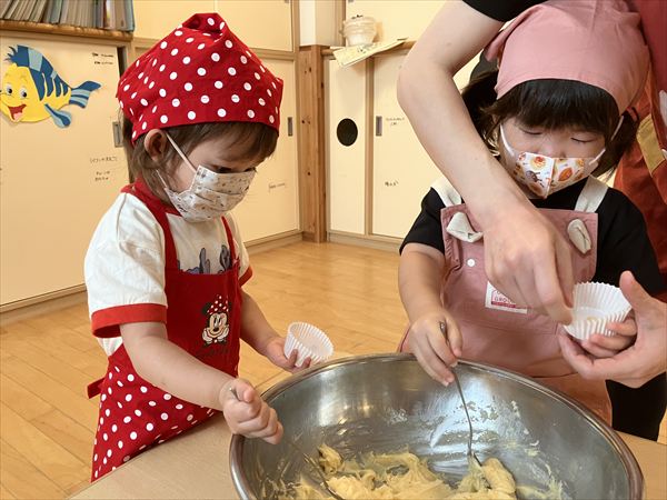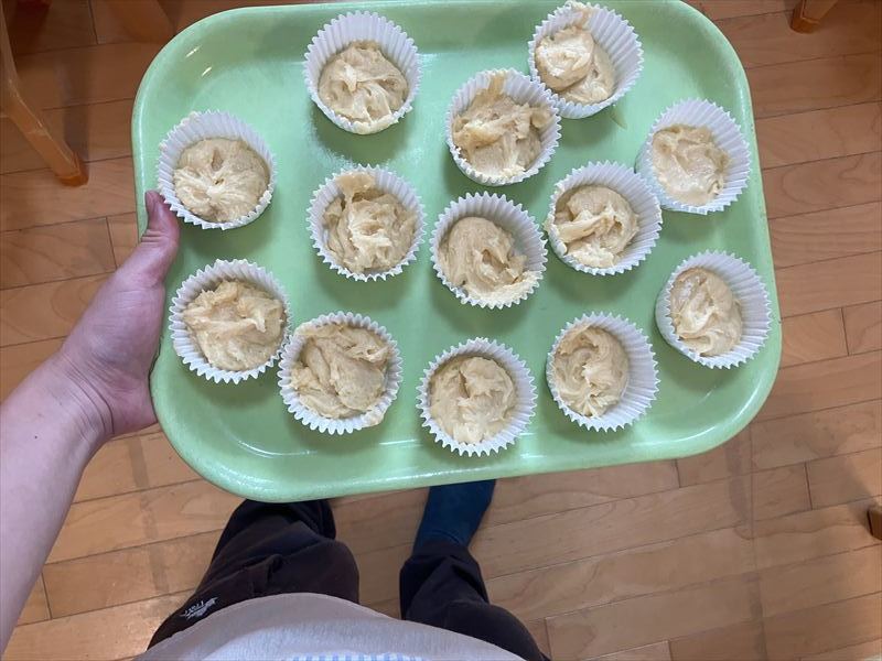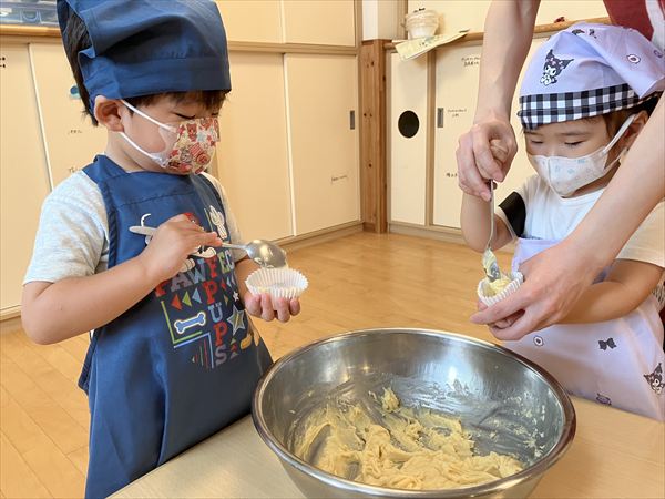 クッキングで蜂蜜マドレーヌを作りました☆生地を入れるのも自分でしていて、スプーンですくってカップに入れています♪