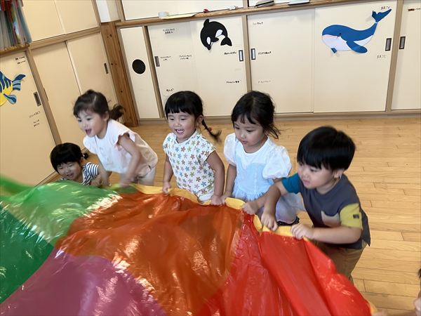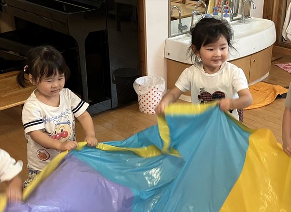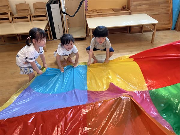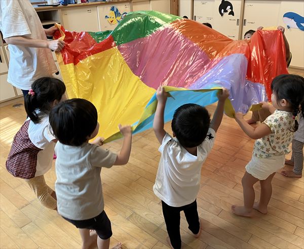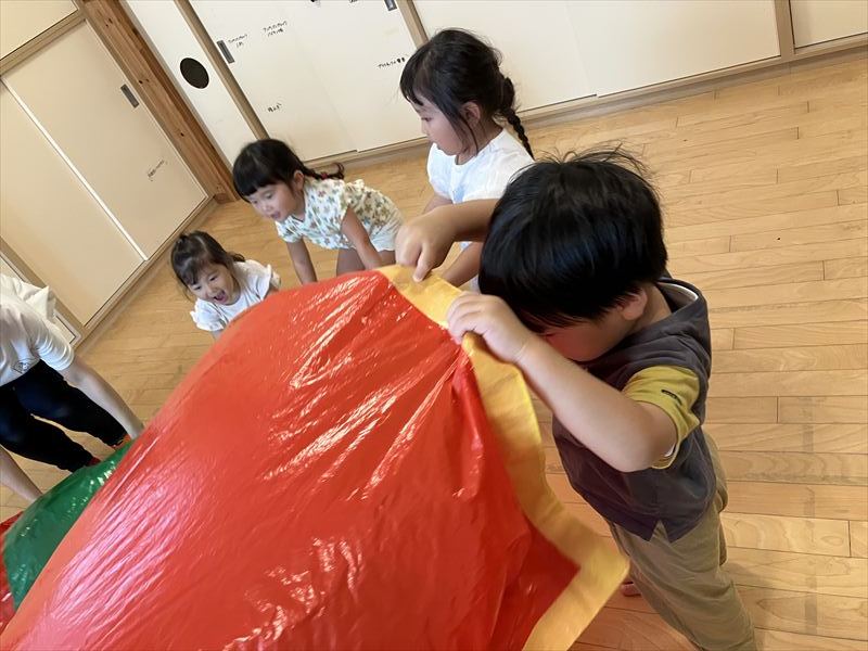 みんなでパラバルーンをしています(^^)子どもたちはビニールをバタバタするだけで大はしゃぎしていました☆