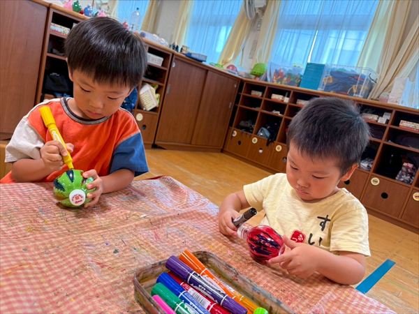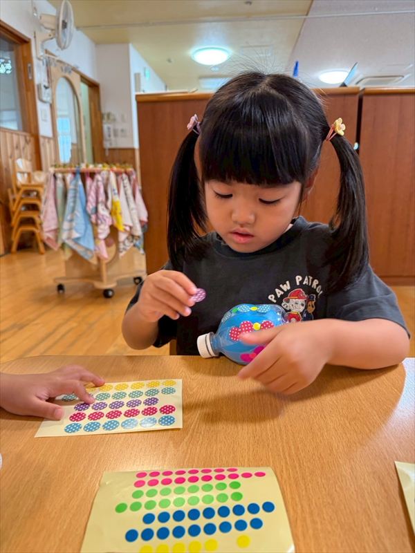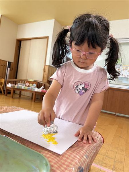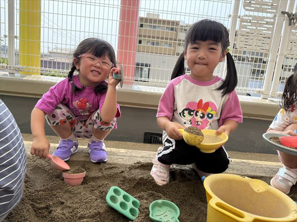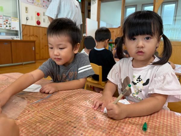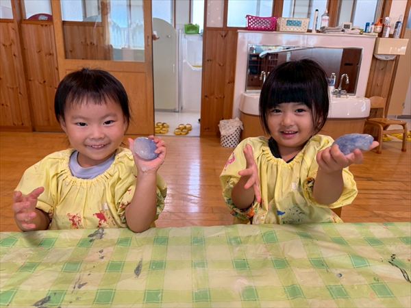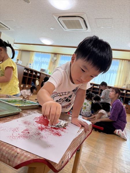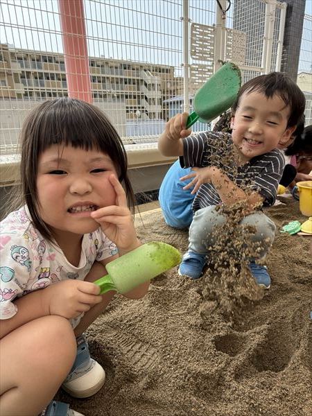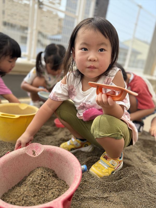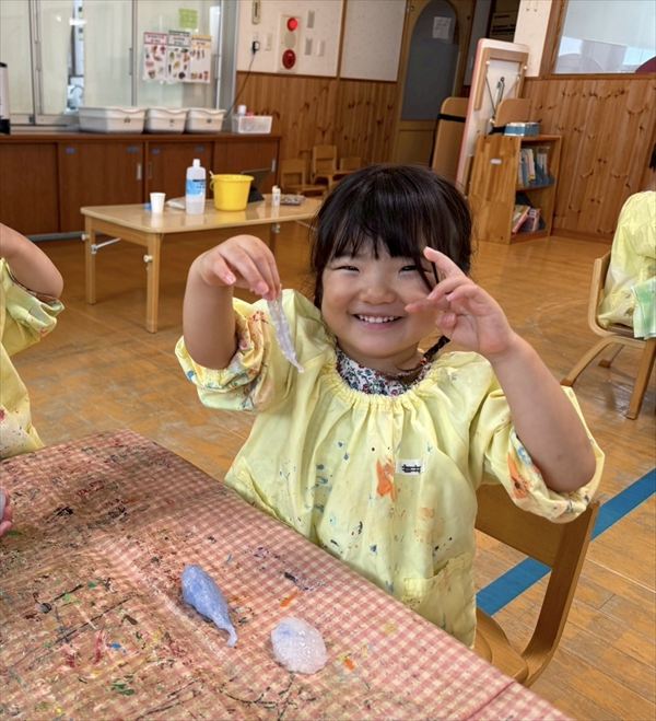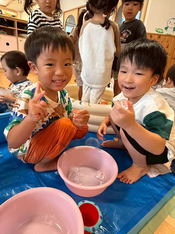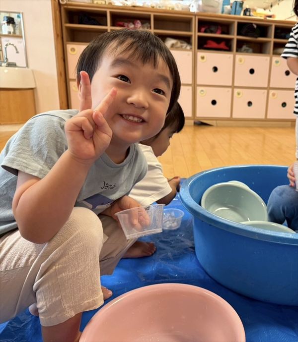 夏最後にスライムや氷遊びを楽しみました(^^♪感触に喜び、ずっと触っていましたよ♪戸外での砂遊びも大好きで、お友だちとやり取りしながら楽しんでいました!