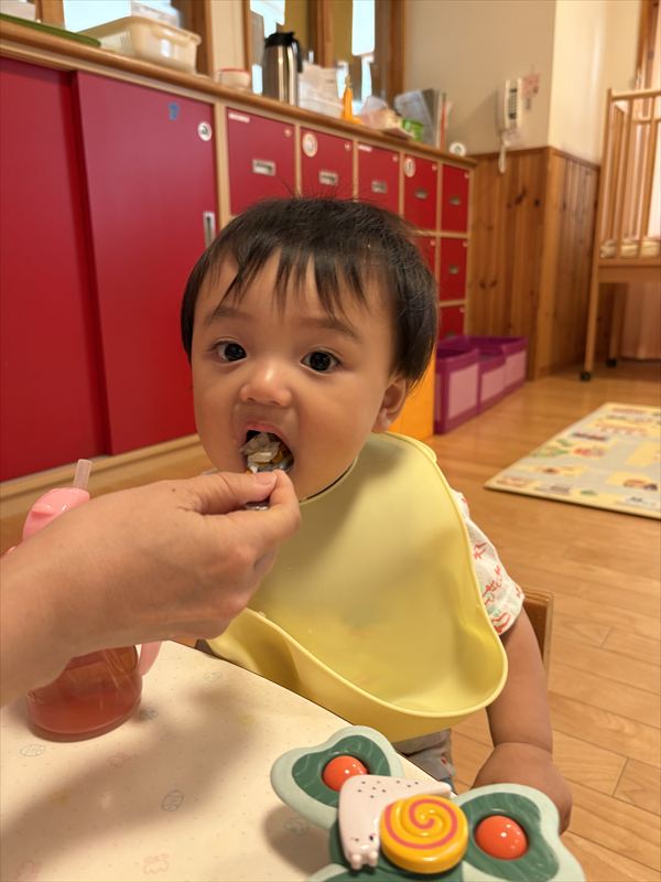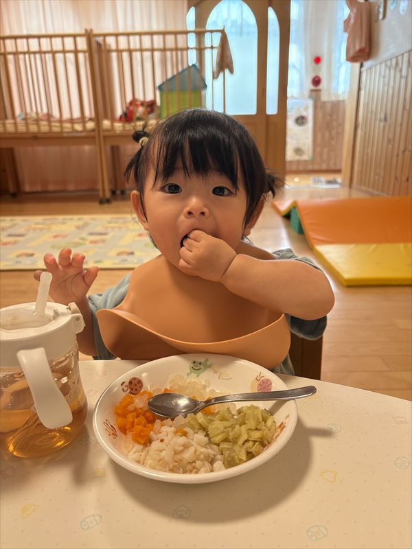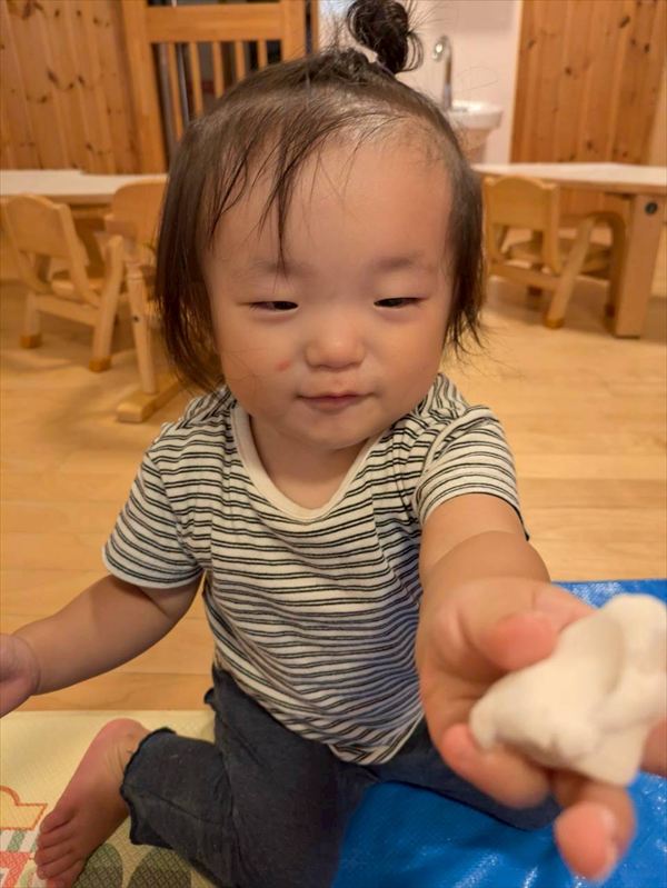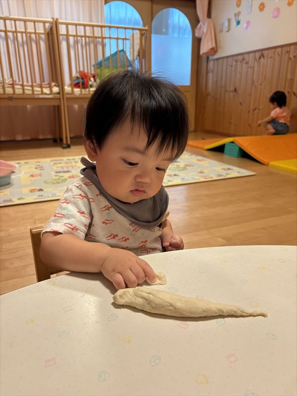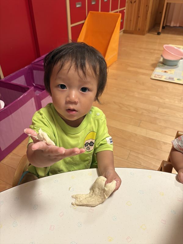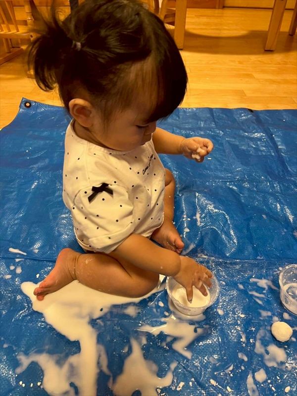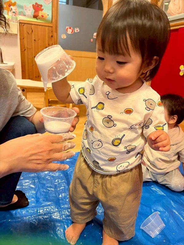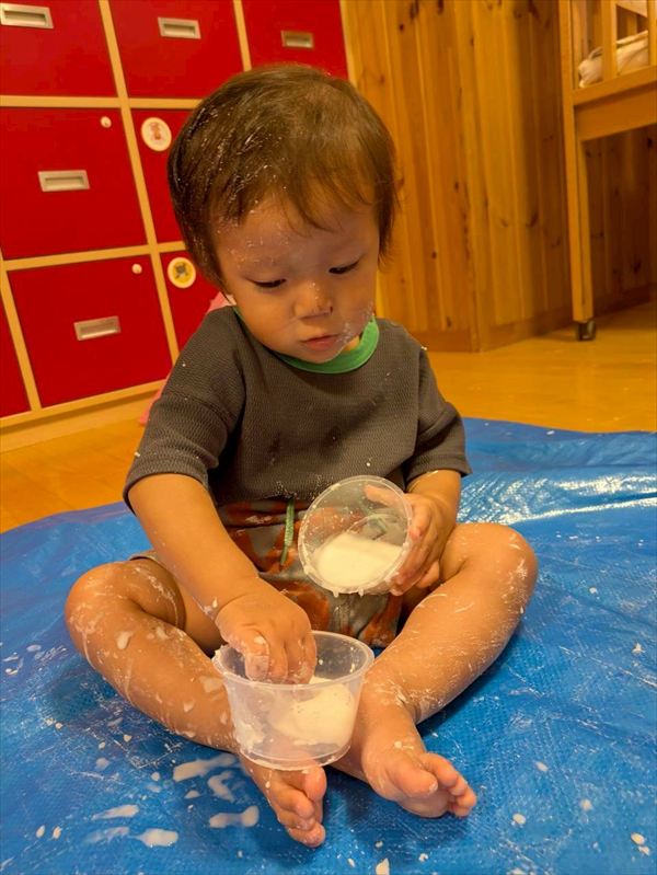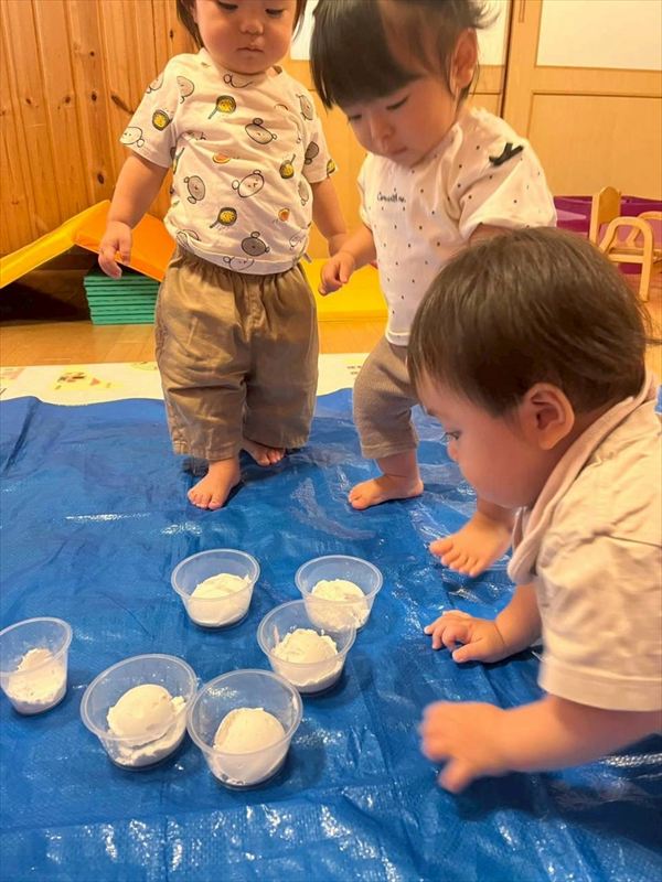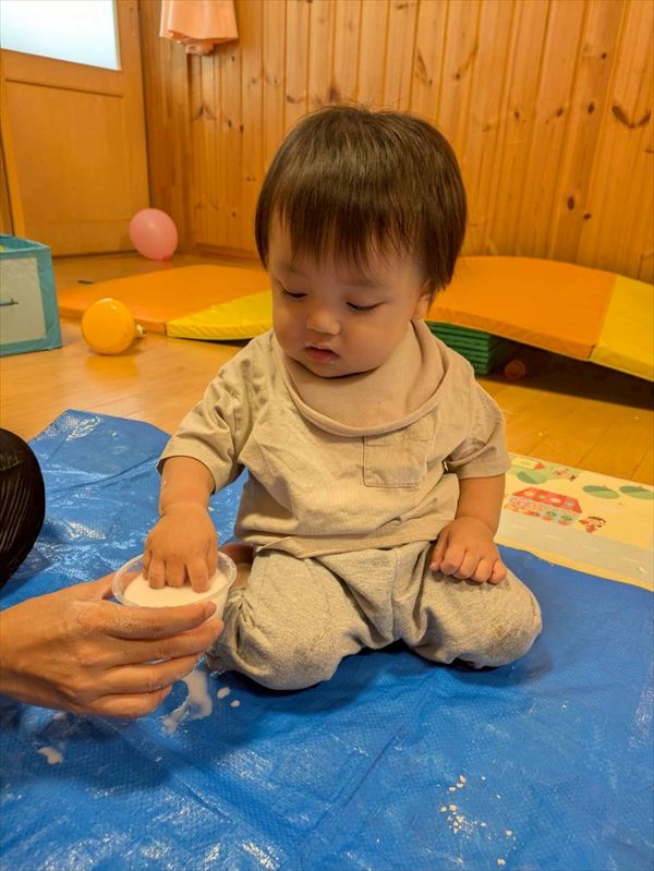 9月のおひさまぐみ VOL.138(2025/10/1更新) 【外遊び】 お外が大好きな子どもたち!いっぱい体を動かして元気いっぱいです 【感触遊び】 片栗粉や小麦粉を使いスライムを作り遊びました!トロトロしたりモチモチしたりする不思議な感触に興味津々な子どもたちでした 【給食の時間】 離乳食や普通食をモリモリ食べて楽しい給食の時間を過ごしています 【室内遊び】 室内では好きなおもちゃを見つけたりシール貼りやエプロンシアターなど様々な遊びを楽しみました