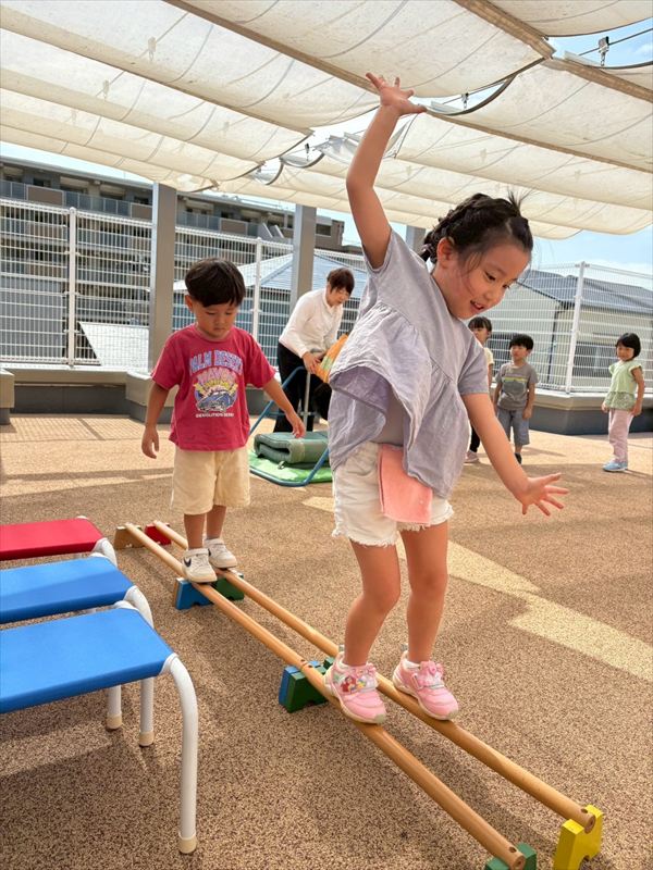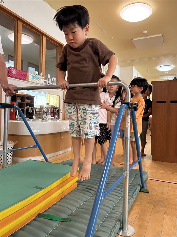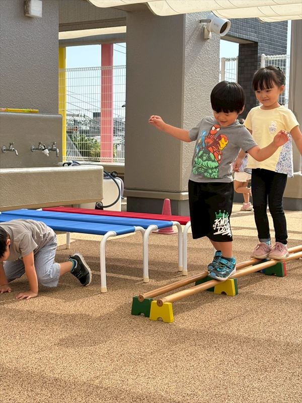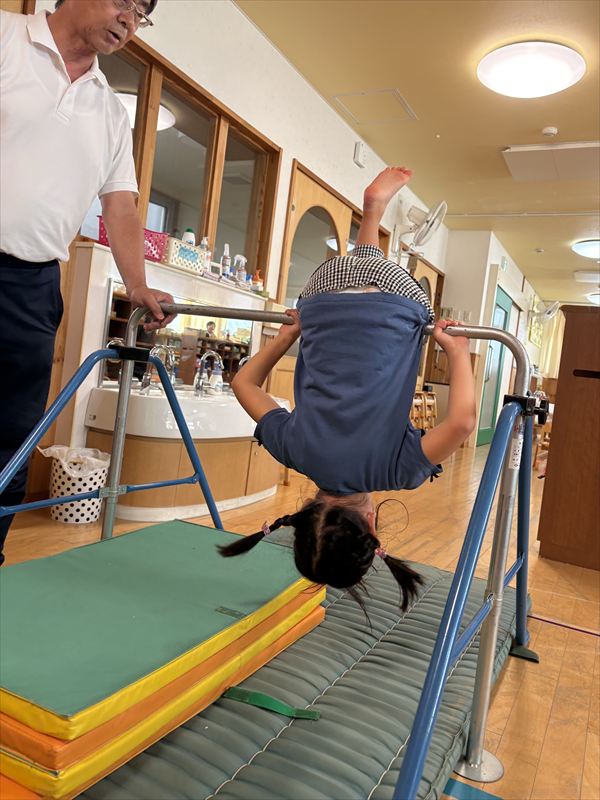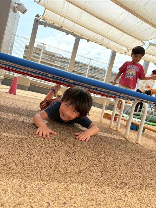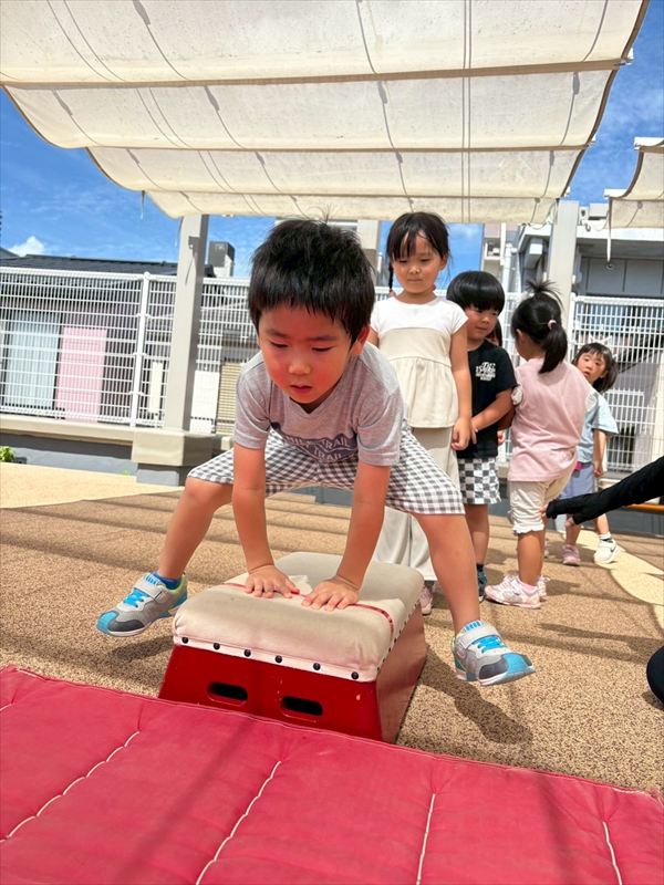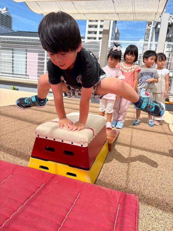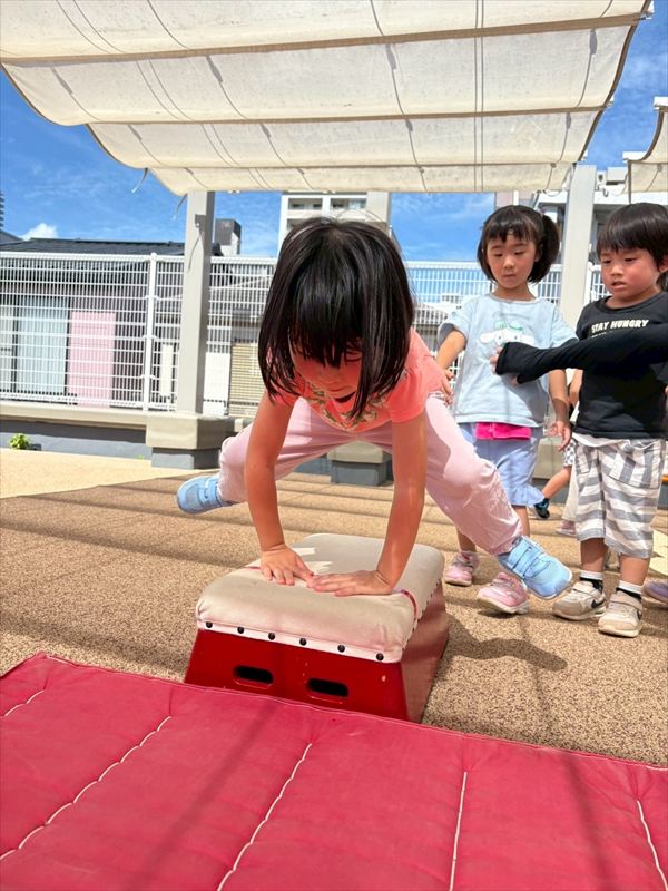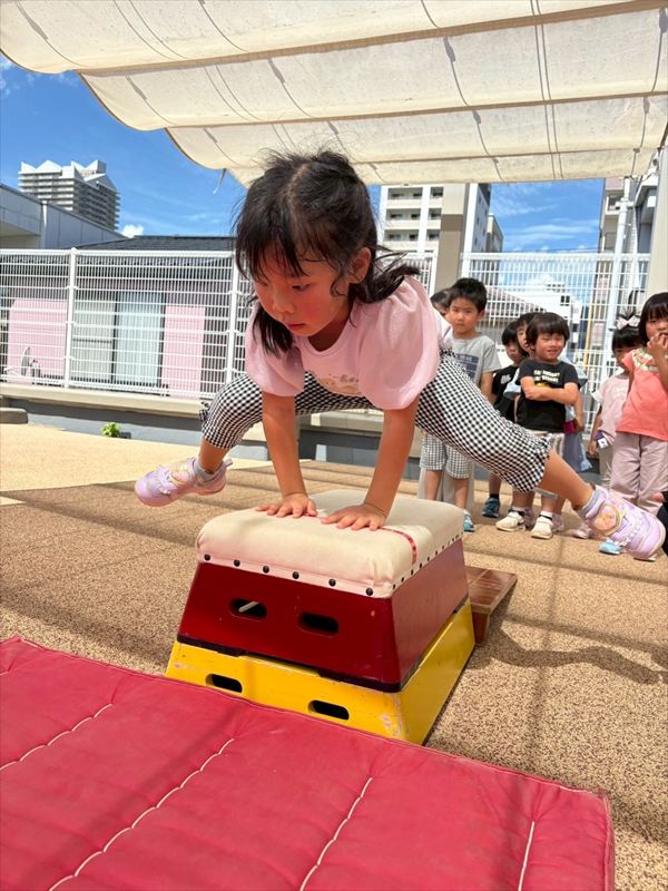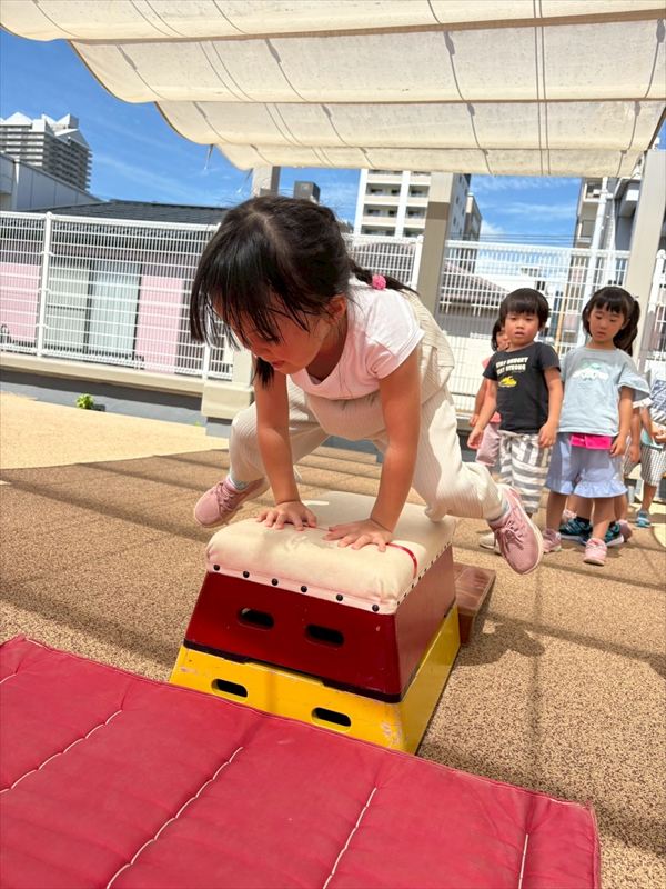 虹組さんが取り組んでいた跳び箱や鉄棒をしてみたいと言っていたので月組さんも挑戦しました!跳び方のイメージはバッチリだったようで1段、2段は余裕な様子でした(*^^*)と同時に5,6段を跳んでいる虹組さんはやっぱりすごいなぁと改めて感じていました!