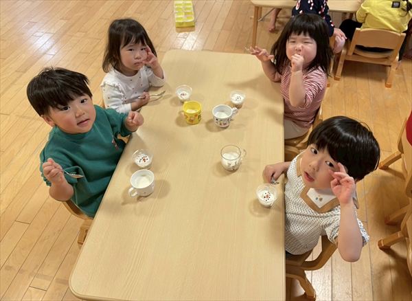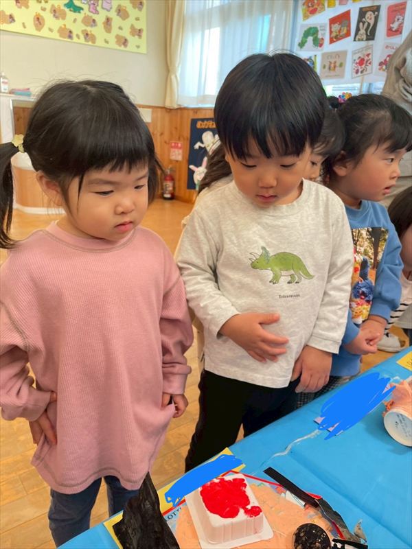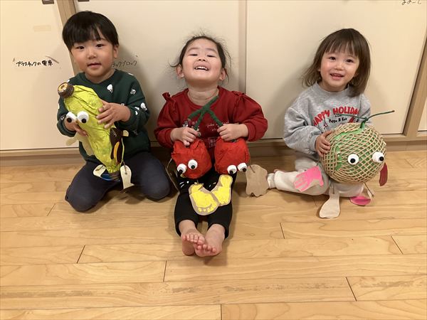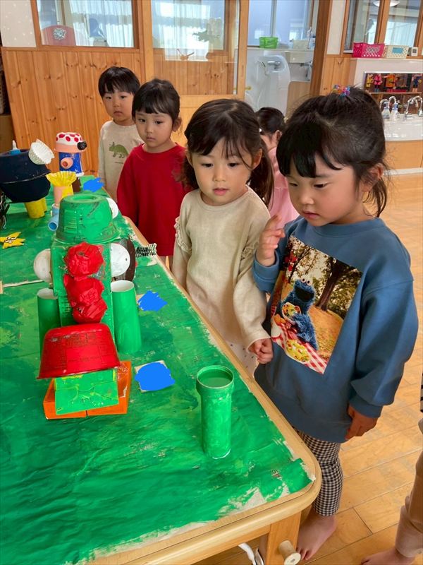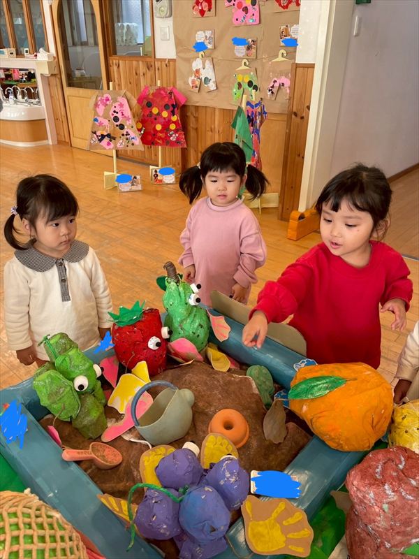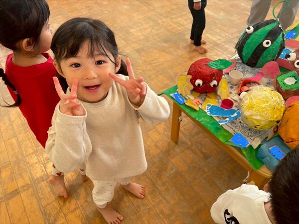 みんなで制作展で飾っている作品を見に行きました(^^)「しろくまちゃんだ!」「救急車あるよ!」と色々な作品を見つけたり、自分が作った果物を見つけてはしゃいで楽しんでいました♪