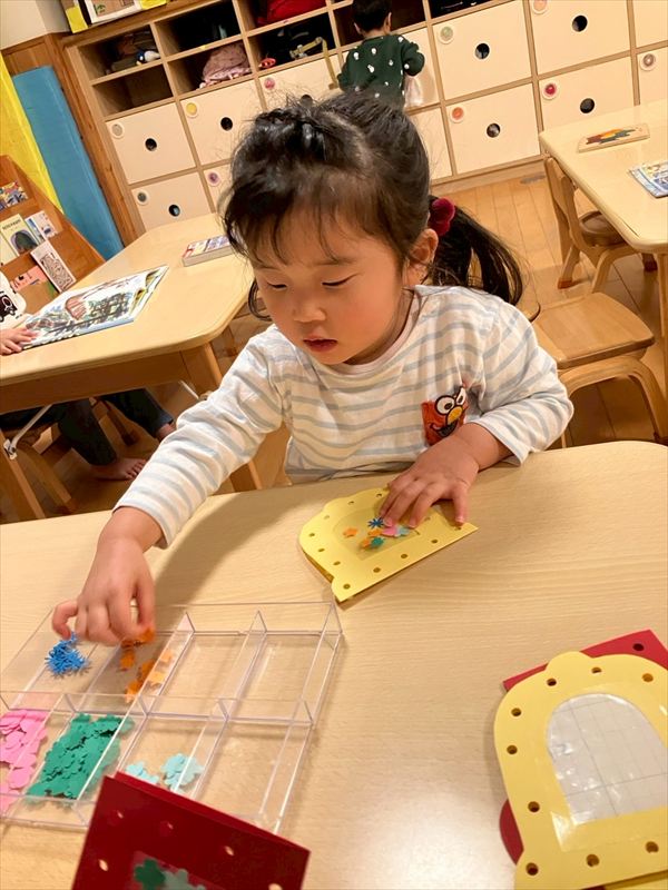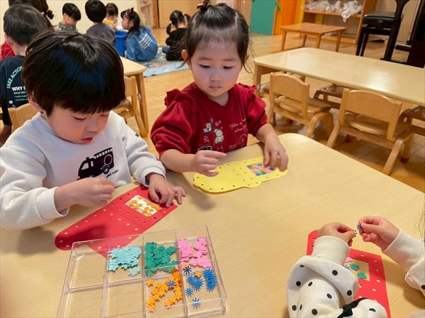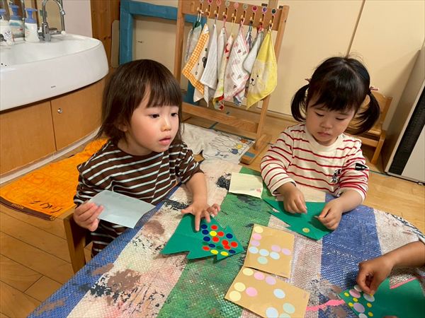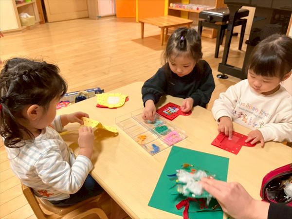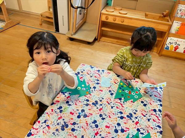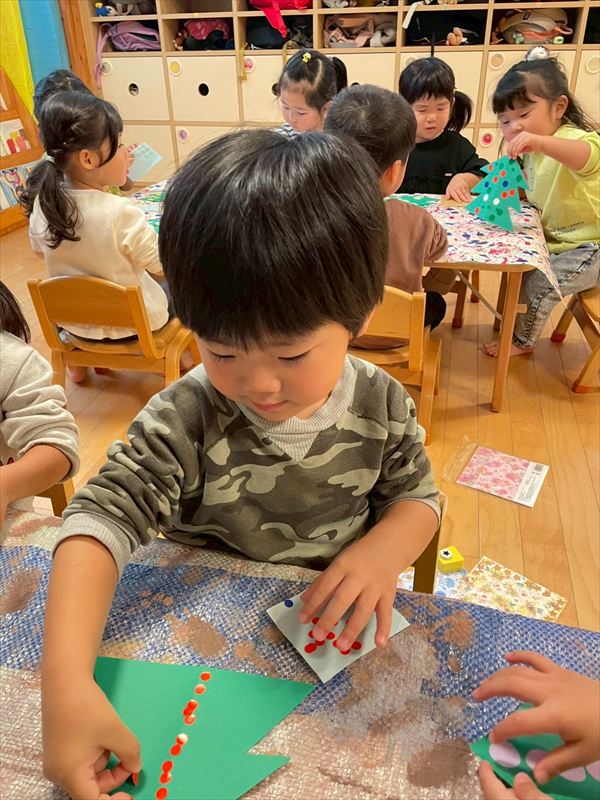 ベルか長靴を選んで室内の壁面に飾るクリスマス制作をしました♪廊下に飾るツリーも作り、お部屋がとっても賑やかになりました☆