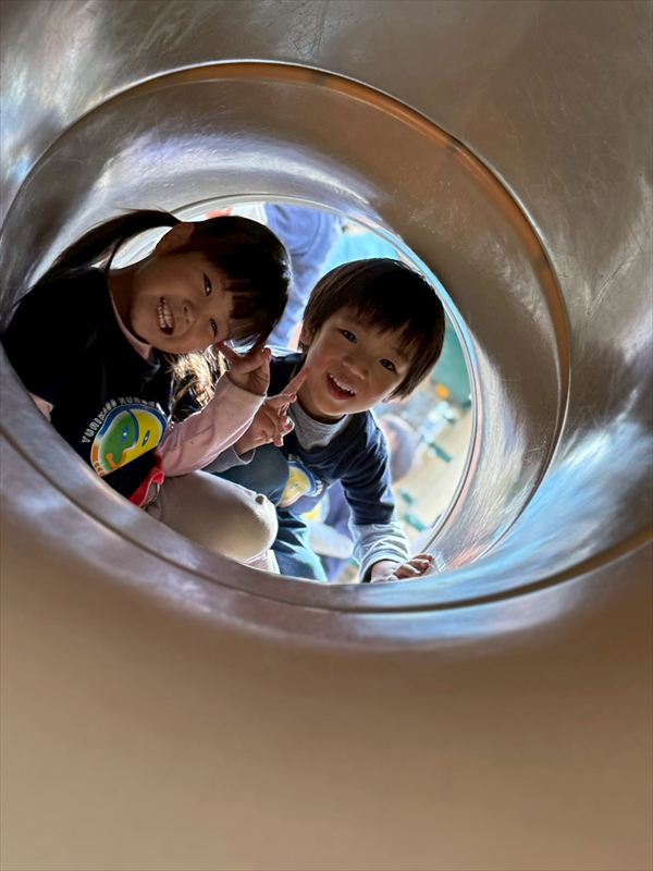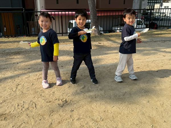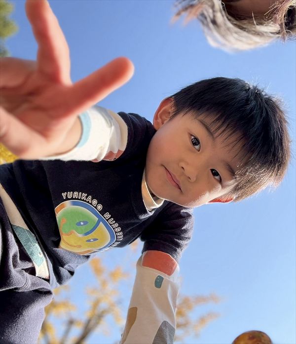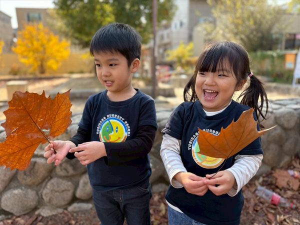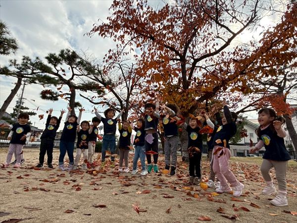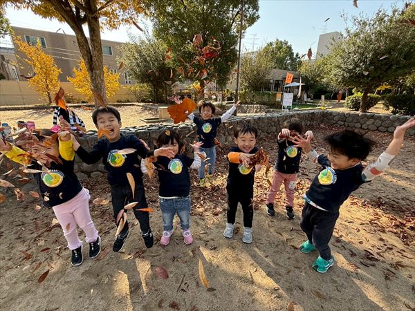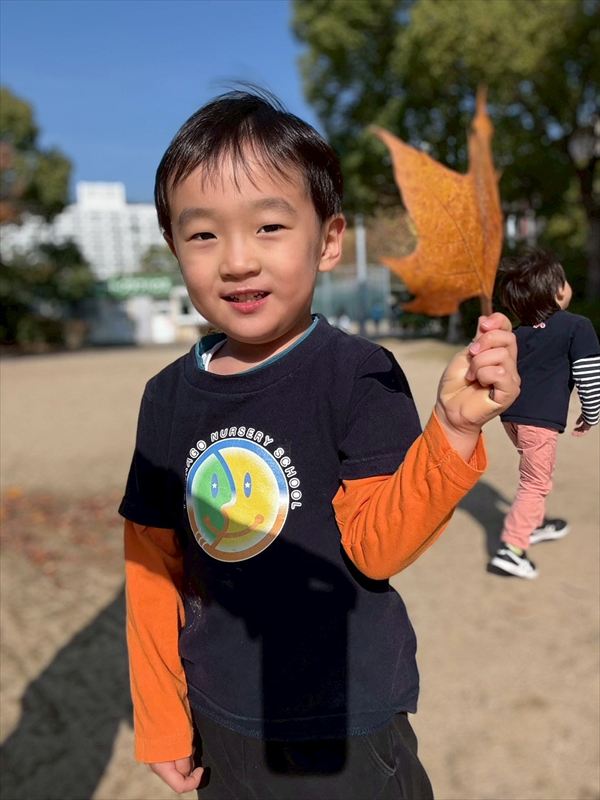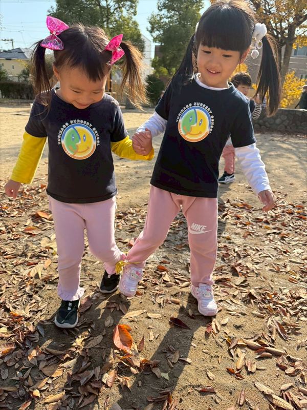 寒くなってきましたが暖かい日も多く元気いっぱい遊んでいました!落ち葉が集まっているところを見つけると、手にいっぱいもってお空へ「それー!」と投げていました!ひらひら降ってくる葉っぱに喜んでいました(^^)遊具も大好きで身体を動かしてたくさん遊んでいましたよ♪