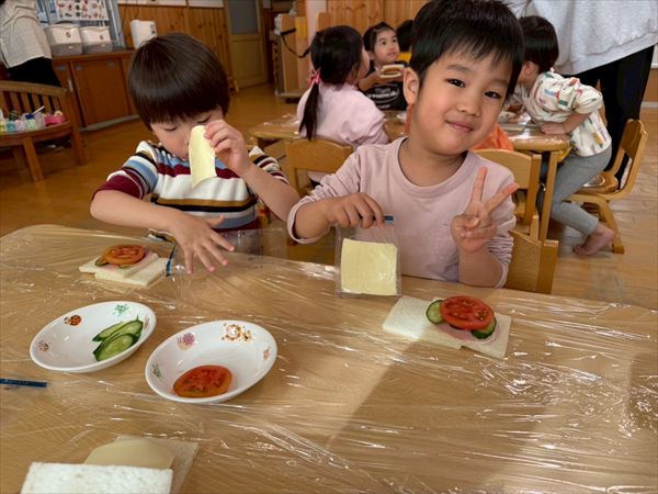 食育としてのお調理の先生と一緒にサンドイッチ作りをしました☆フェルトのサンドイッチ練習したり、絵本をよんでもらったりして興味津々でした☆自分で作ったサンドイッチは大きくて美味しくてあっという間に完食していました(^^)