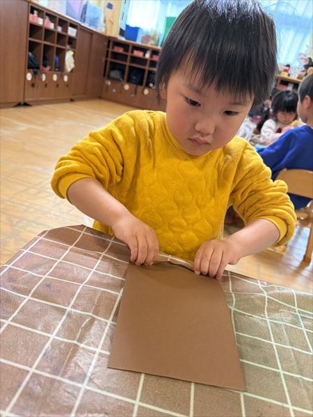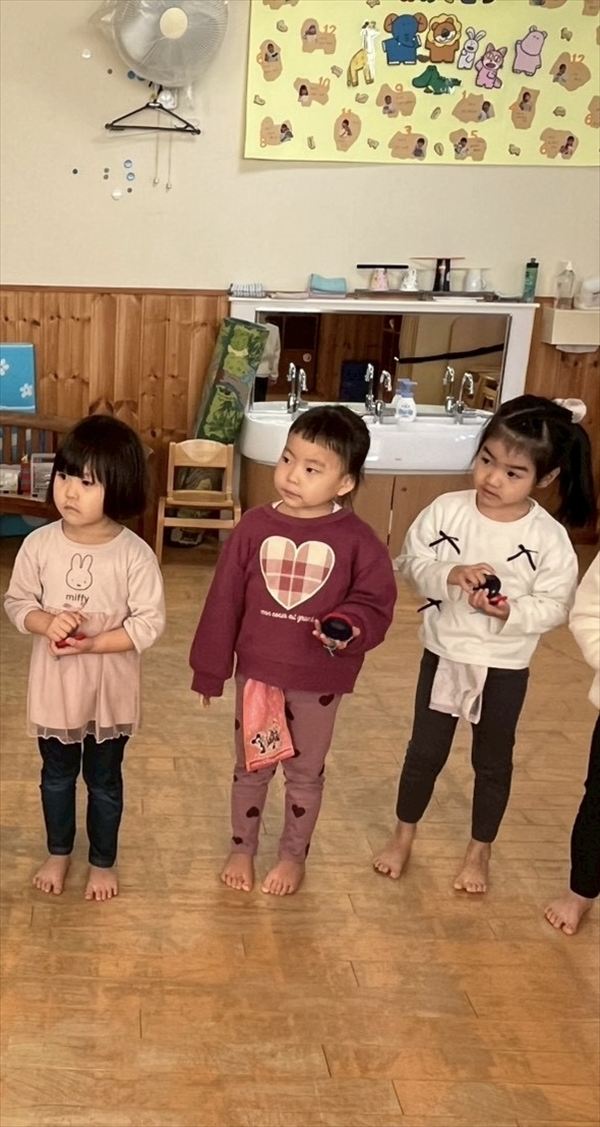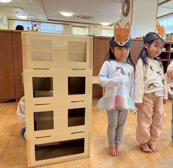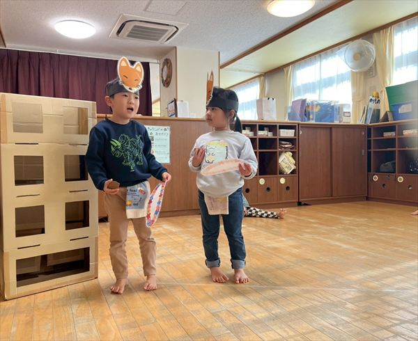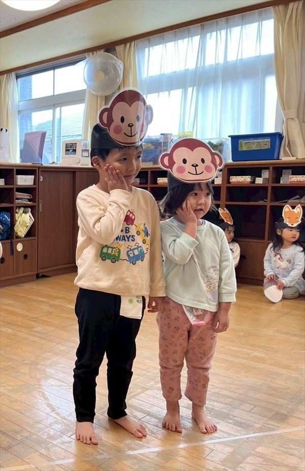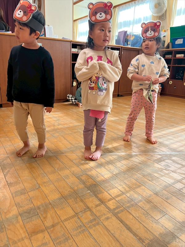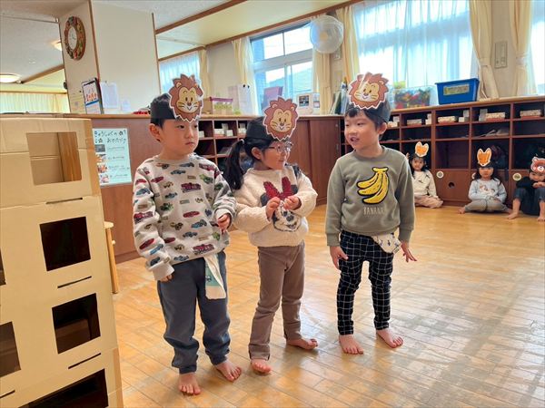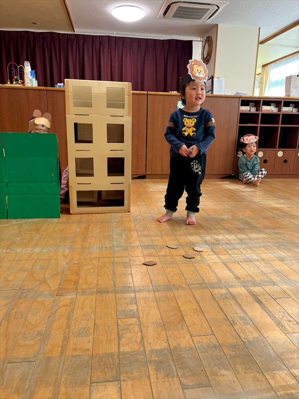人前に立つと緊張している様子が見られますが、台詞を自ら言ってみたり動物になりきってみたりして楽しめるようにもなってきました!色々な役を交代しながらしてみて、劇に興味を持って取り組んでいます!