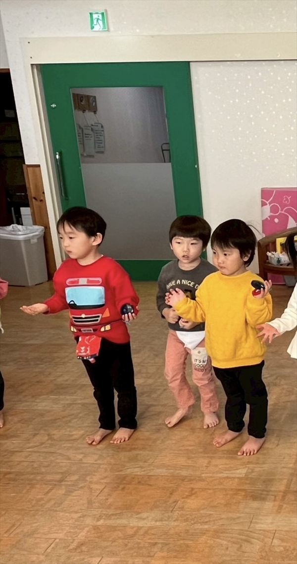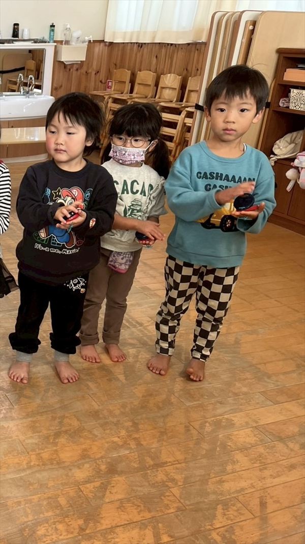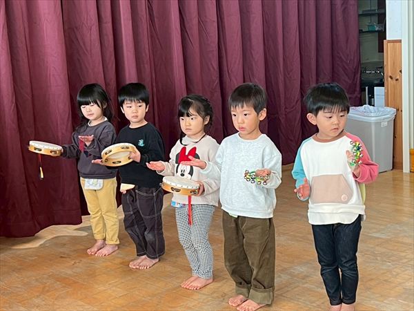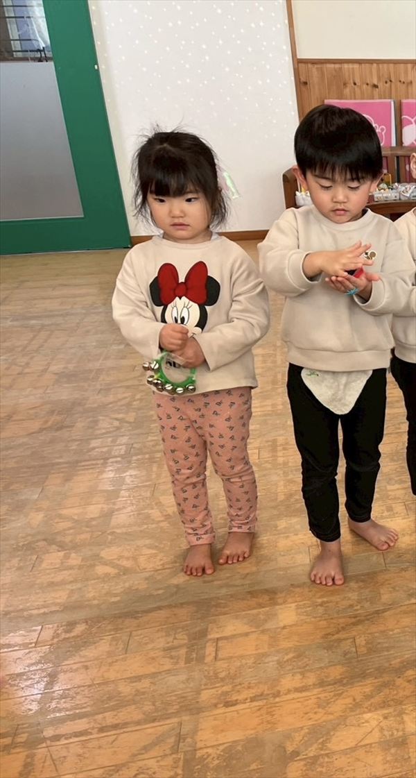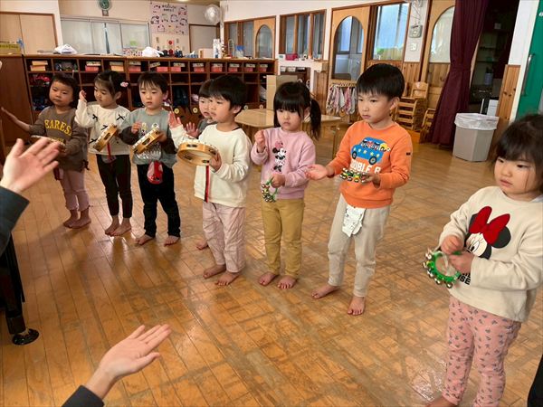 リズム遊びを楽しんでいました!色々な楽器を使って様々なリズム打ちをしましたが、指揮を見ながら上手に音を鳴らすことができていました!「次はこれしたい!」としたい楽器を見つけて楽しんでいました☆