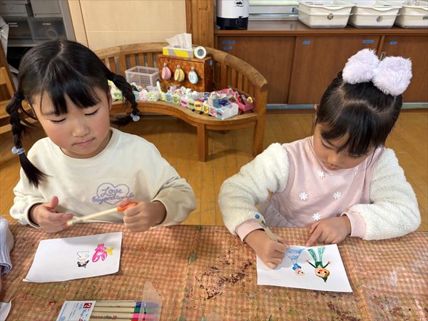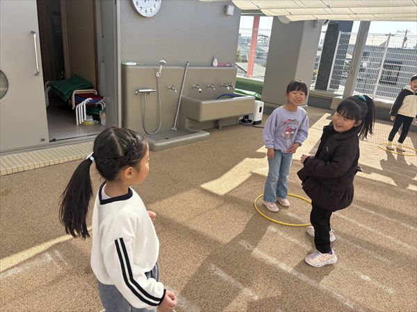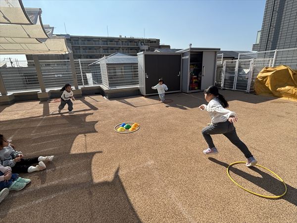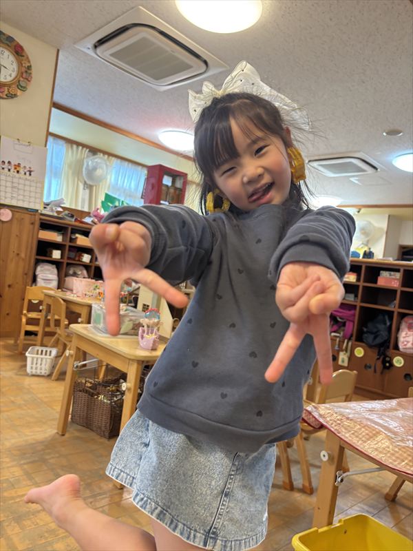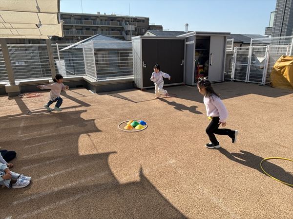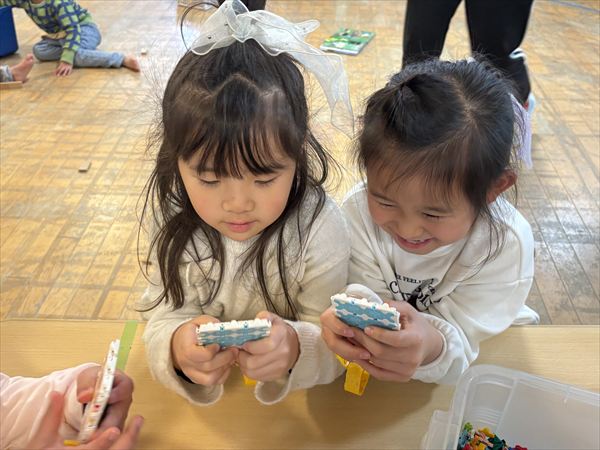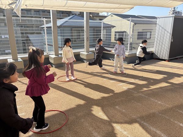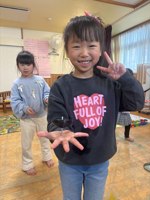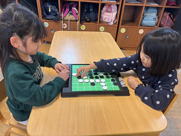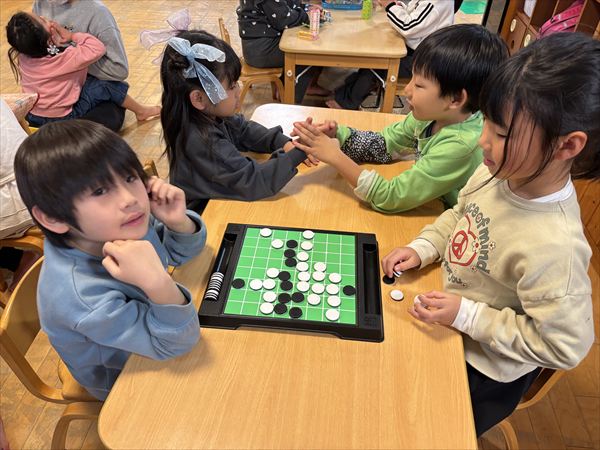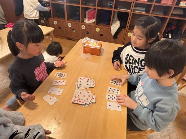 最近室内遊びではオセロやトランプ、こまが流行っています!ラキューでは女の子は特にスマホやイヤリングを作ることを楽しんでいます♪走ることが大好きな虹組さんは、外に出ると寒さに負けず元気に走り回って遊んでいます(^^)