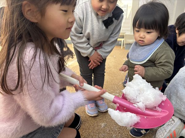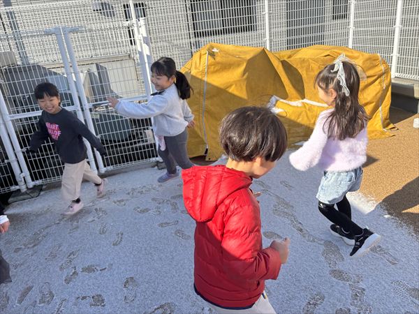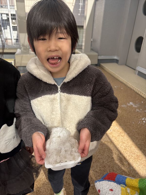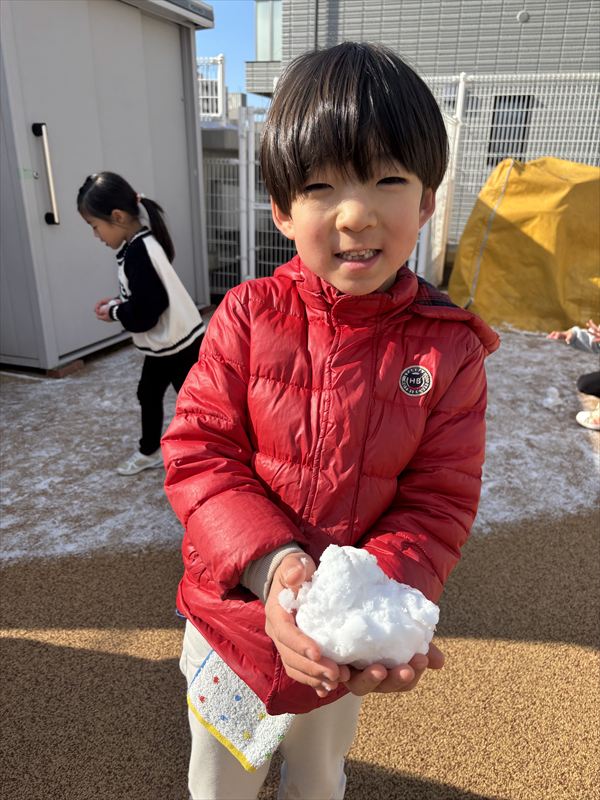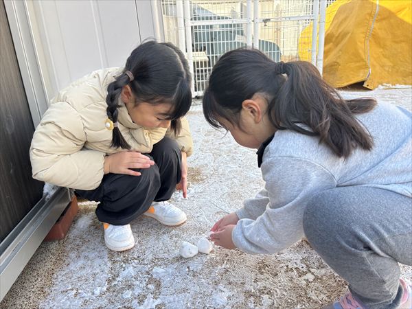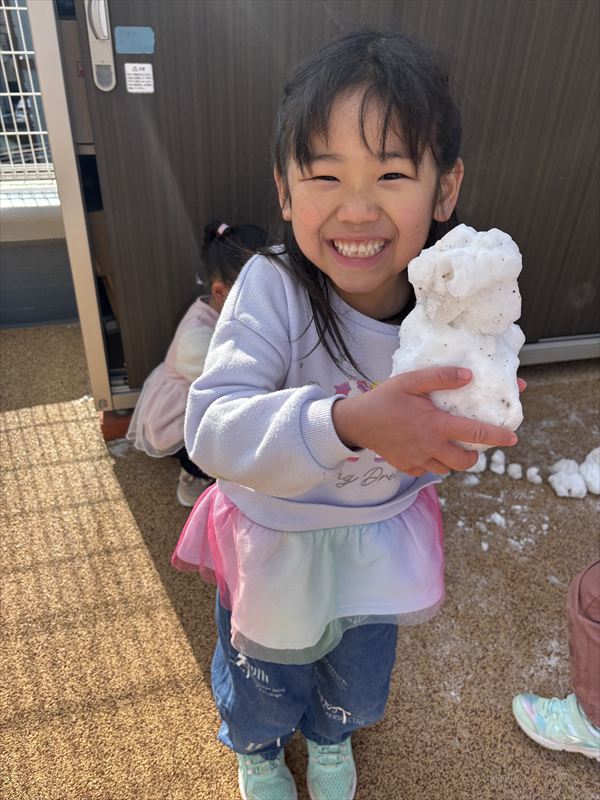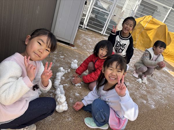 前の日に降った雪が少し積もっていたので雪で遊びました☆雪が積もること自体珍しいので、子どもたちは大喜びでした!小さな雪だるまをたくさん作りました