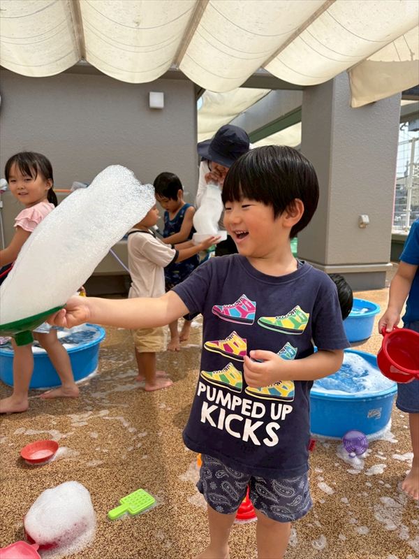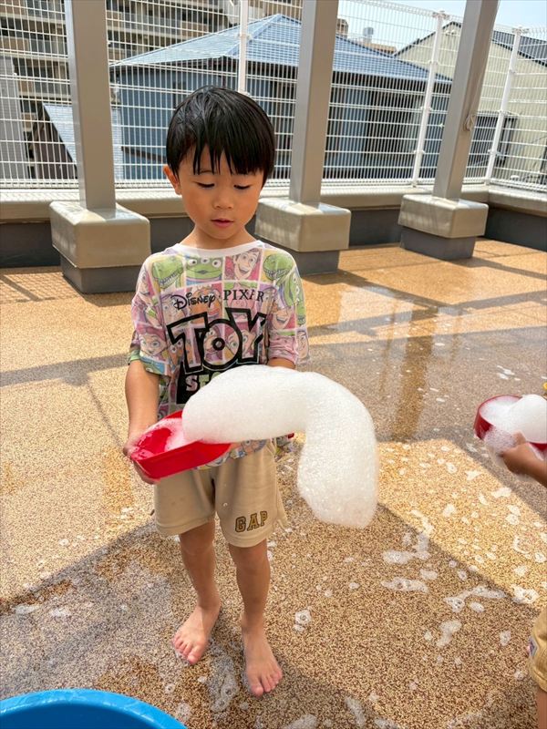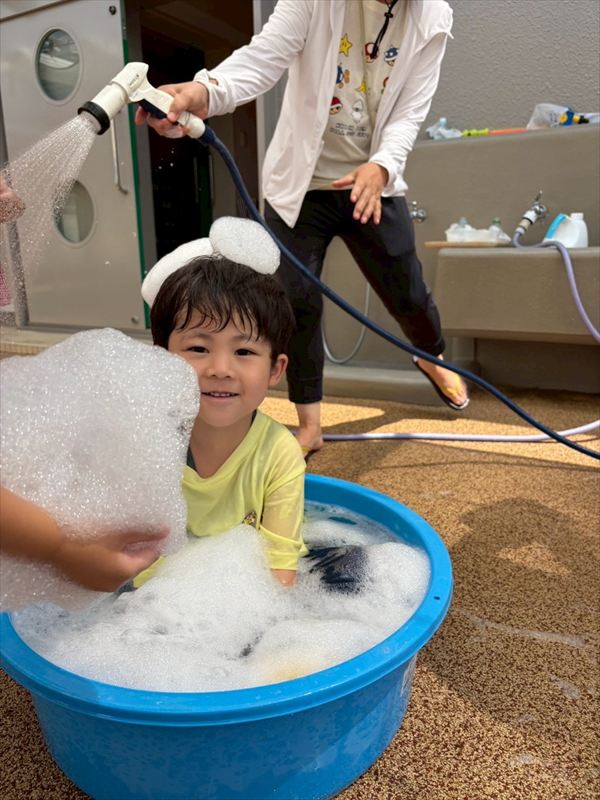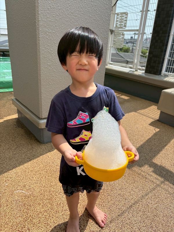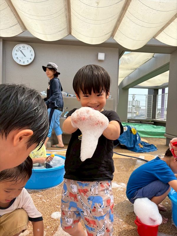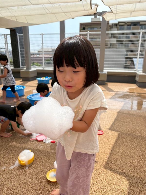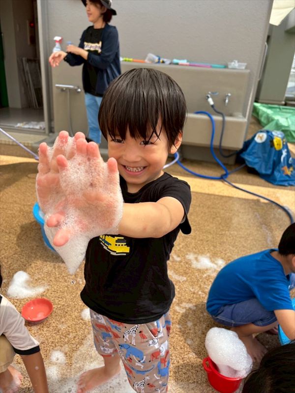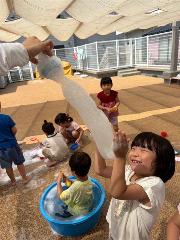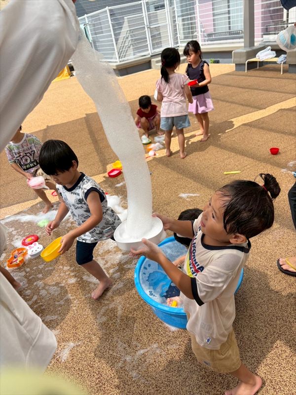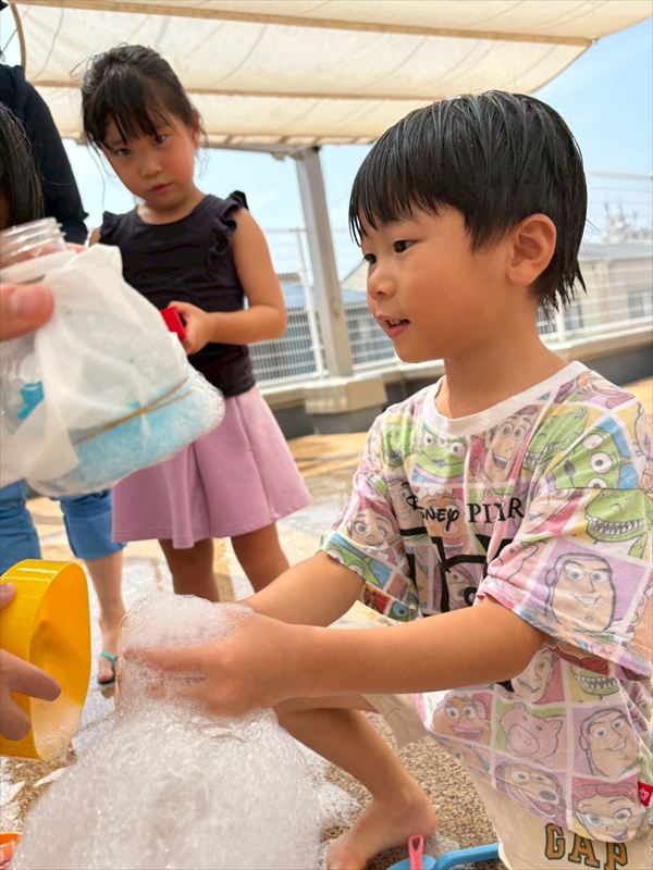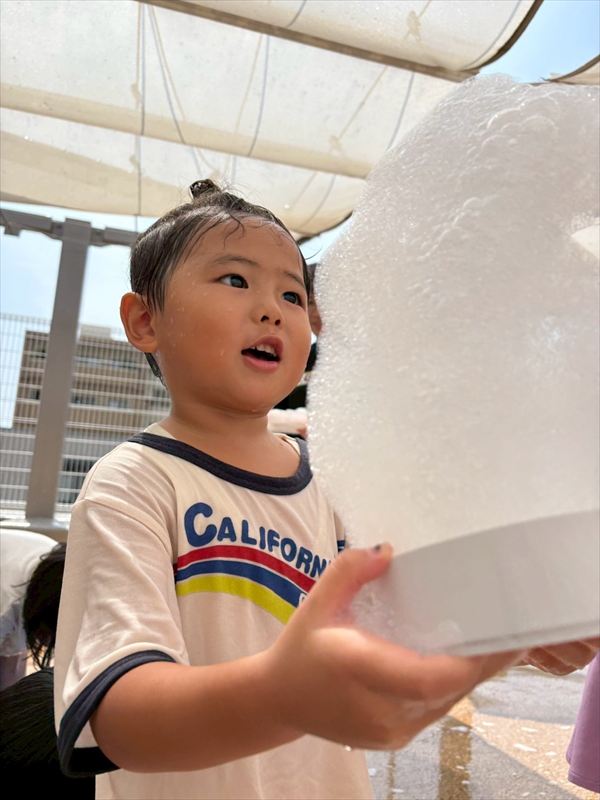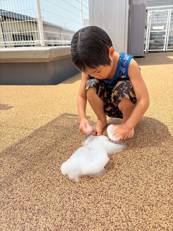 子どもたちが大スキな泡遊びをリベンジ!モッコモコの泡が長く繋がると倒さないようにバランスをとって歩いたり、おままごとをたのしんでいました。