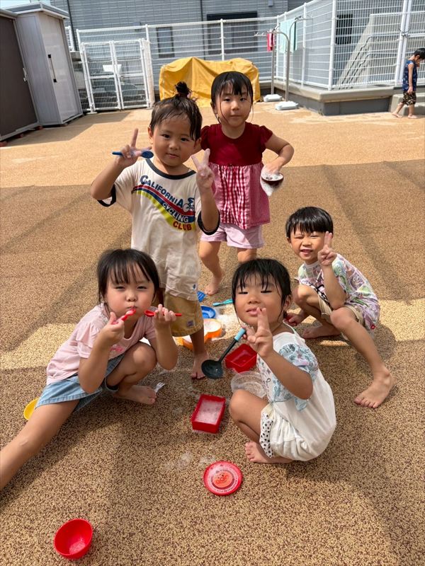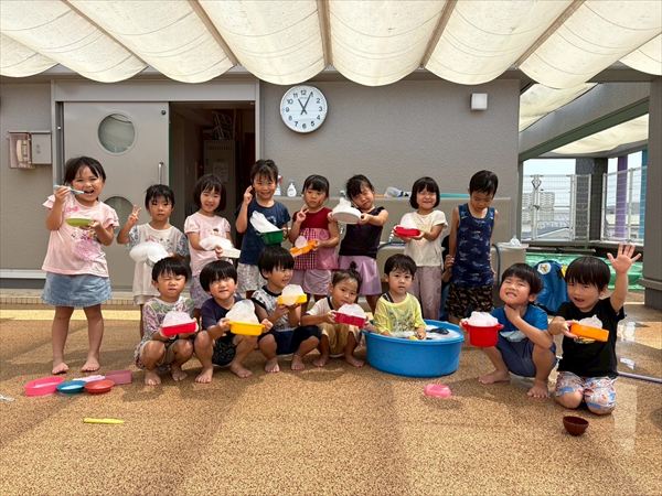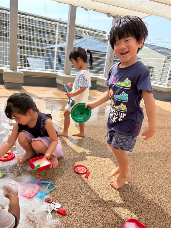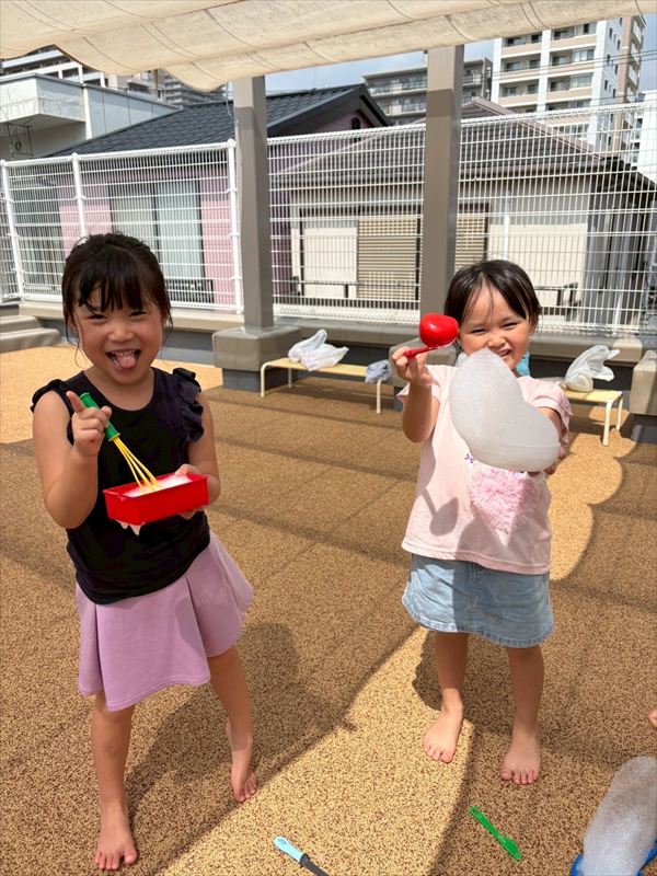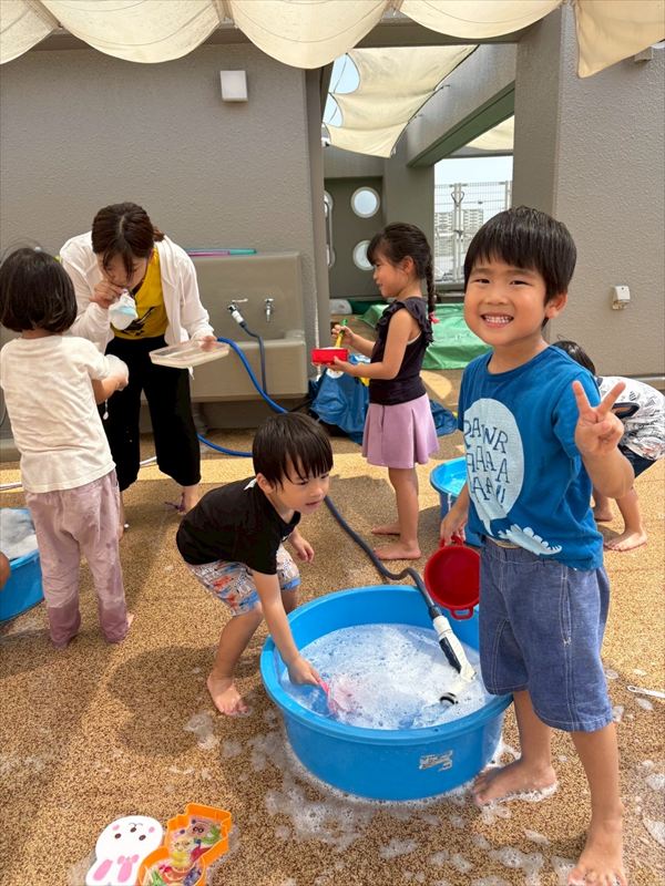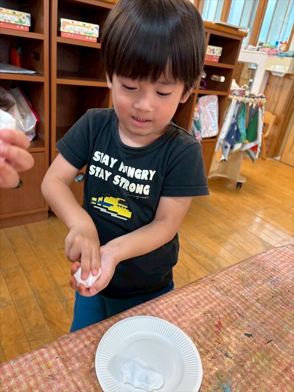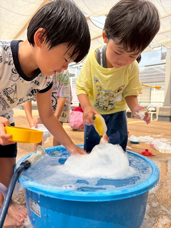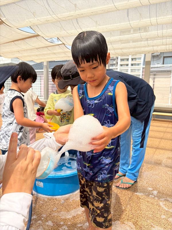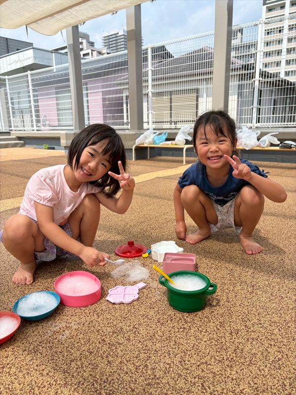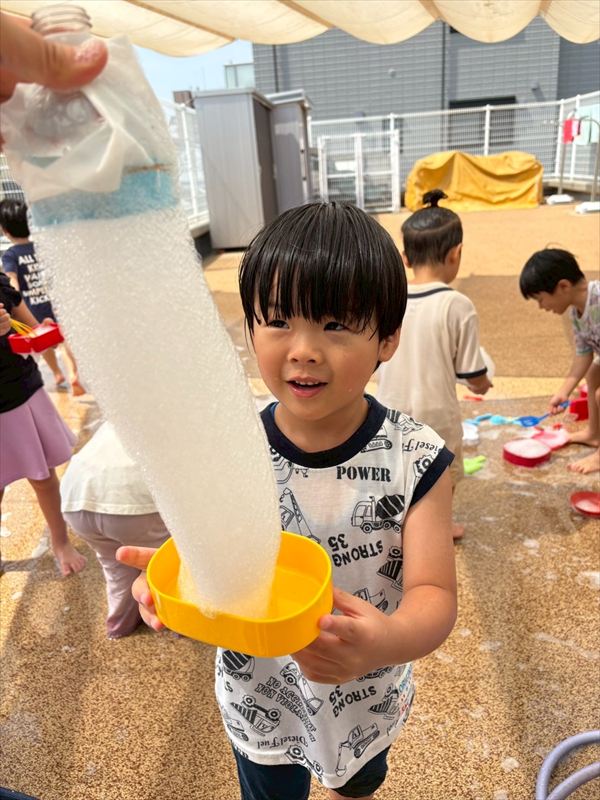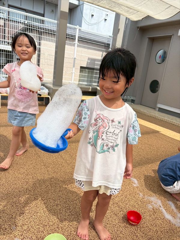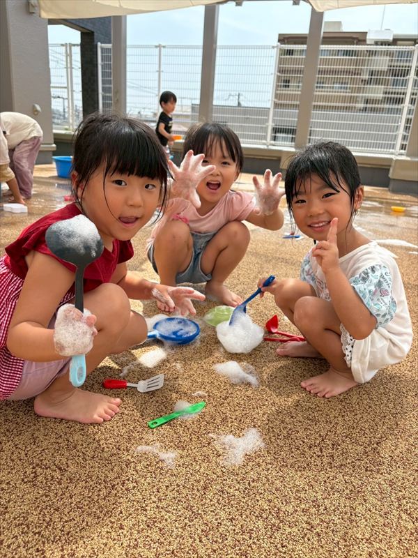 子どもたちが大スキな泡遊びをリベンジ!モッコモコの泡が長く繋がると倒さないようにバランスをとって歩いたり、おままごとをたのしんでいました。